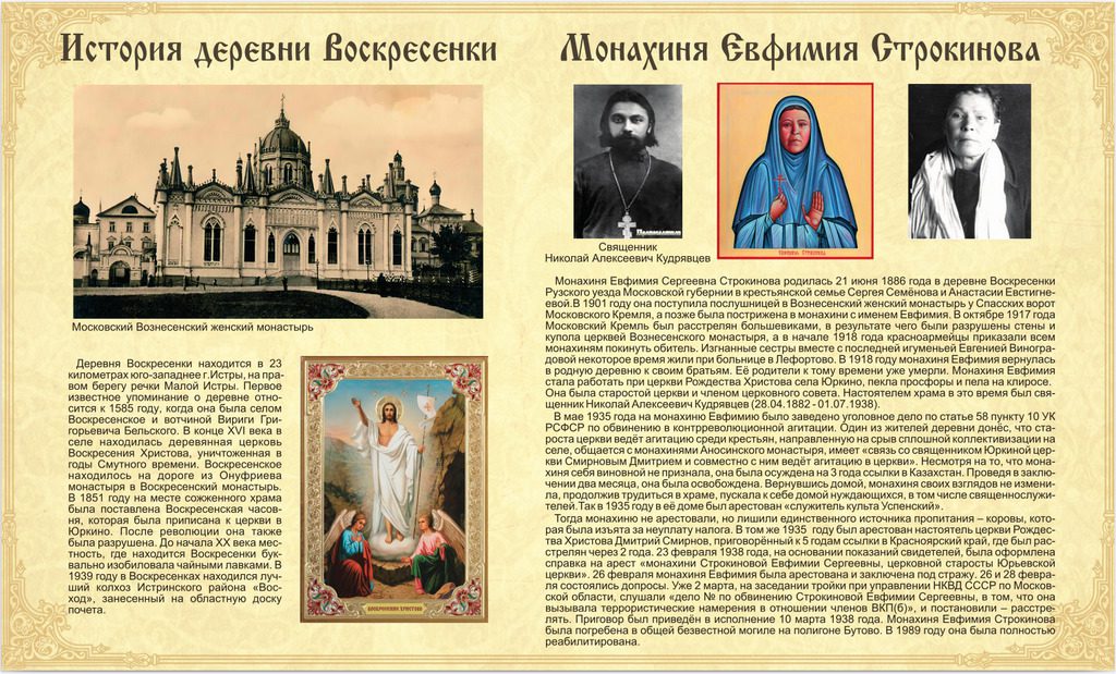 13 августа прихожане Казанского храма села Глебово установили информационный стенд с жизнеописанием насельницы Вознесенского монастыря в Кремле монахини Евфимии (Строкиновой) в деревне Воскресенки на святом роднике. Это родное село матушки, куда она вернулась после закрытия монастыря в 1918 году. Вернувшись на родину, она служила старостой Христорождественского храма с. Юркино. В 1938 году монахиня была арестована и расстреляна на Бутовском полигоне.