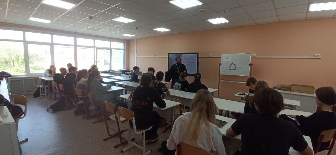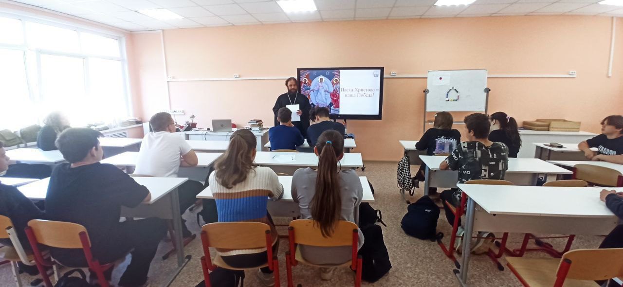 21 мая в рамках епархиальной миссионерской акции «Пасха Христова – наша Победа» настоятель храма Рождества Пресвятой Богородицы в Шитьково иерей Димитрий Пищерков провёл урок в МОУ “Детгородковская средняя общеобразовательная школа” Волоколамского м.о. для учащихся 8 класса. В презентации отец Димитрий рассказал ребятам о традициях празднования Пасхи Христовой, особое внимание уделив Пасхе 1945 года и ее связи с Победой нашего народа в Великой Отечественной Войне. В завершении встречи священник ответил на вопросы школьников.