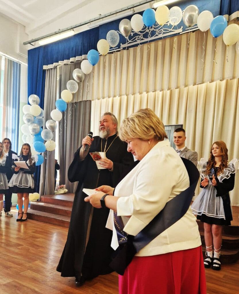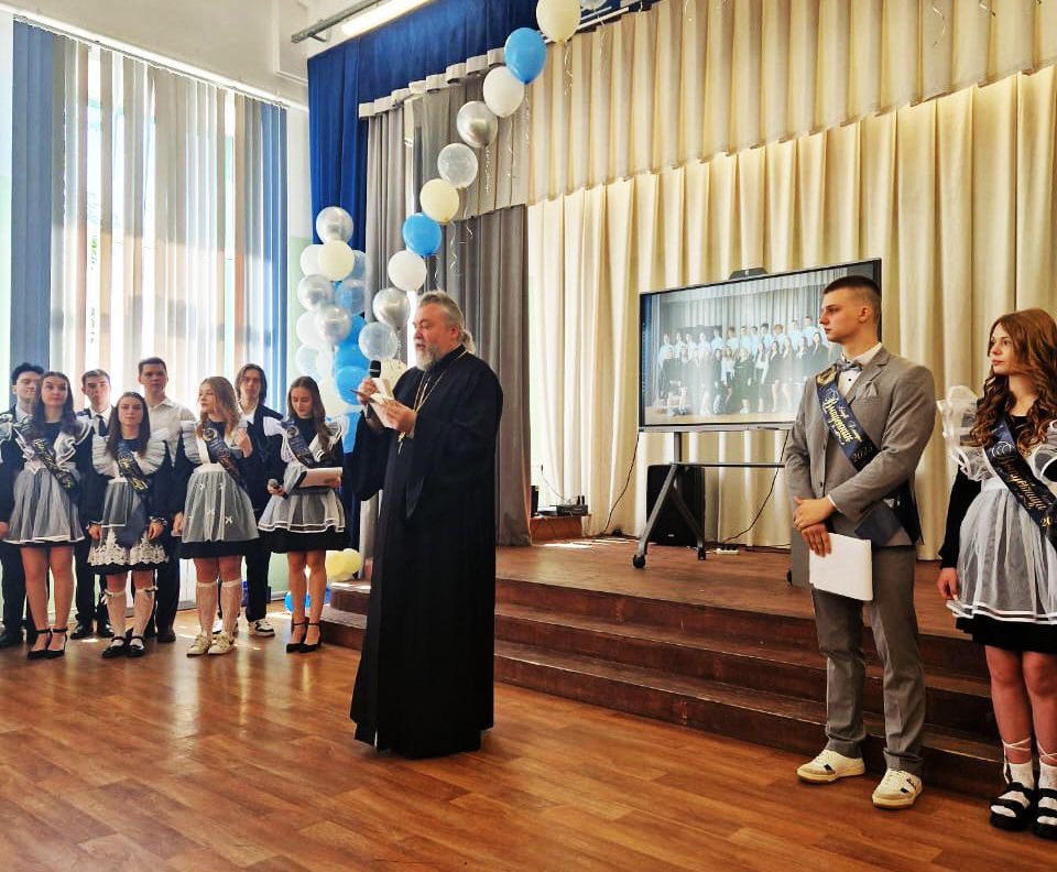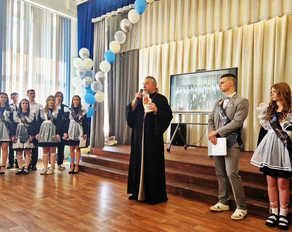 Батюшка поздравил выпускников школы с пасхальными днями, днем Великой Победы и завершением их учебы. Пожелал всем помощи Воскресшего Спасителя в жизни, успехов на экзаменах, здоровья и счастья. В завершение раздал всем выпускникам школы и гостям мероприятия пасхальные открытки.