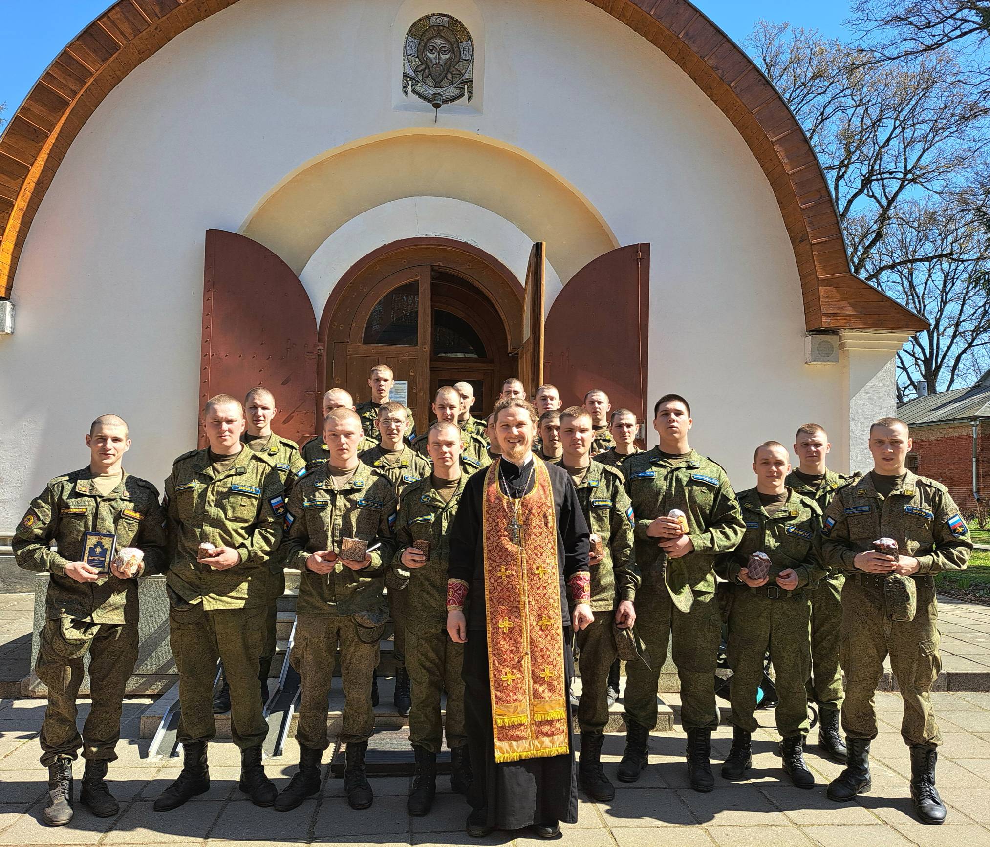 20 апреля в храме святого благоверного великого князя Александра Невского в посёлке Санатория имени Герцена военнослужащие вместе со священником храма Димитрием Овчинниковым прославили песнопениями Воскресшего Господа Бога и Спаса нашего Иисуса Христа. Во время встречи с бойцами отец Димитрий рассказал историю праздника Пасхи и символическое значение пасхальных яств, которые были вручены каждому солдату.