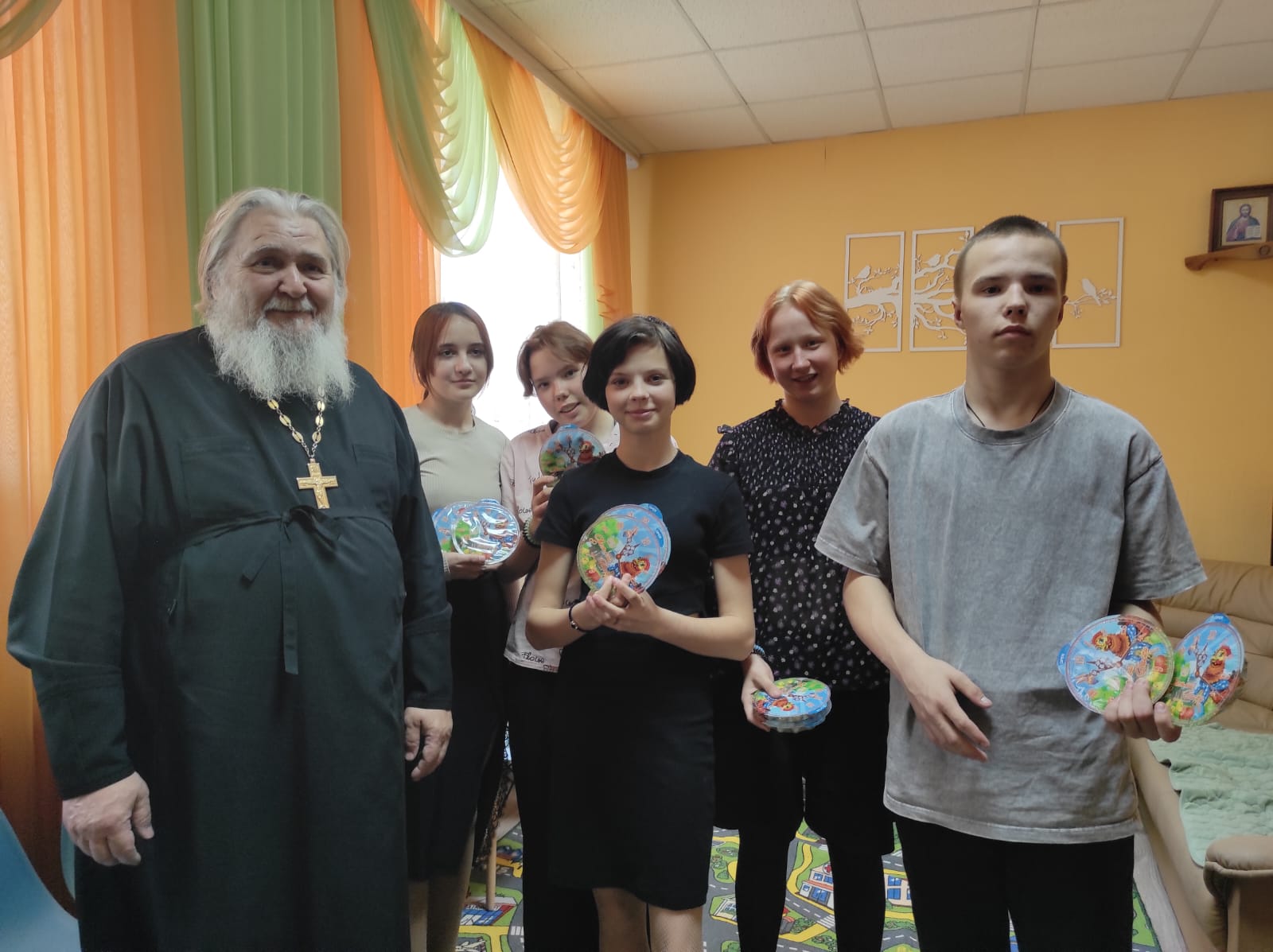 С Праздником Светлого Христова Воскресения ребят поздравил иерей Андрей Сергейчук, клирик храма Рождества Богородицы с.Суворово. Священник побеседовал о празднике и подарил пасхальные подарки.