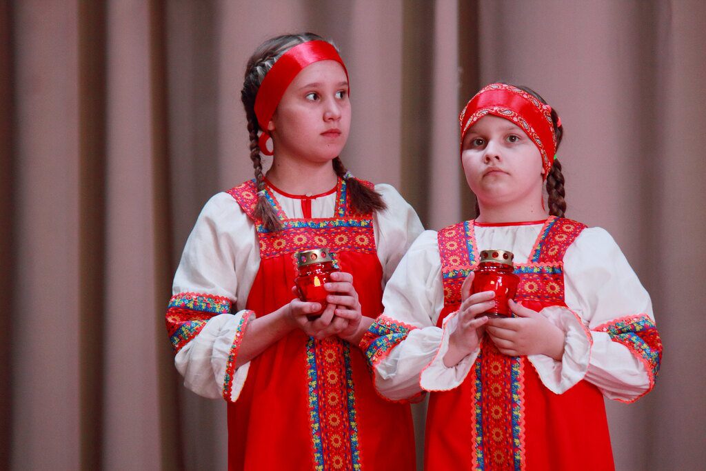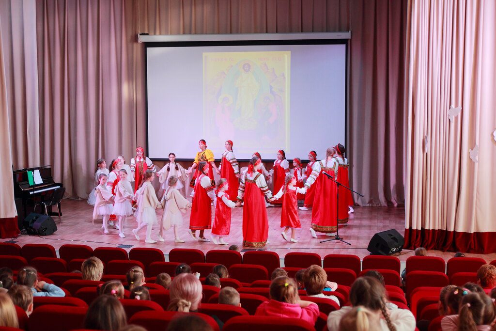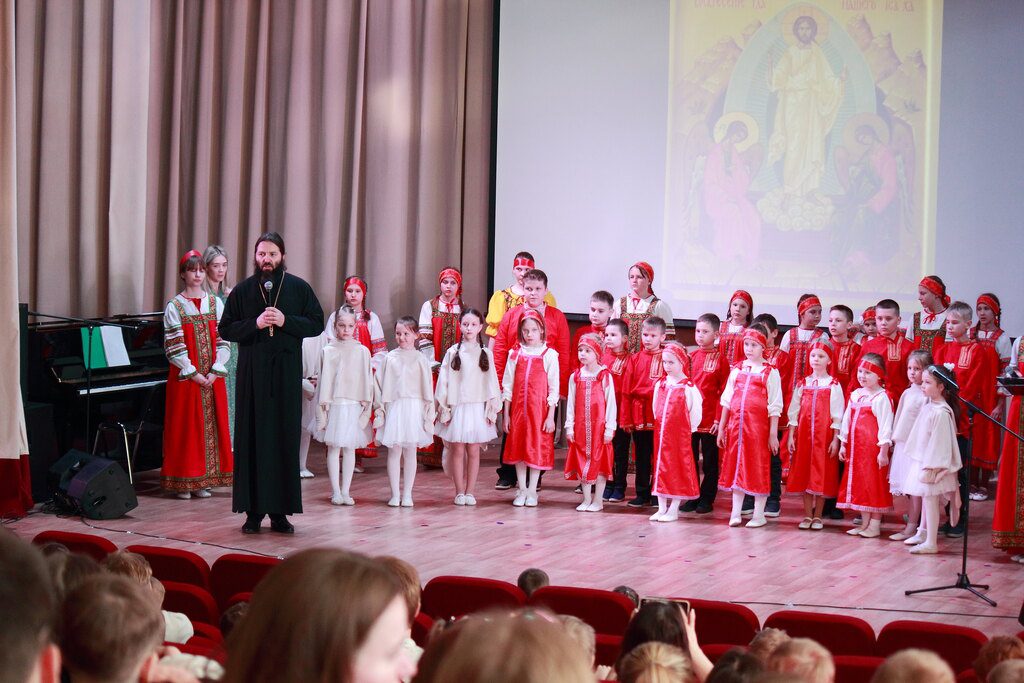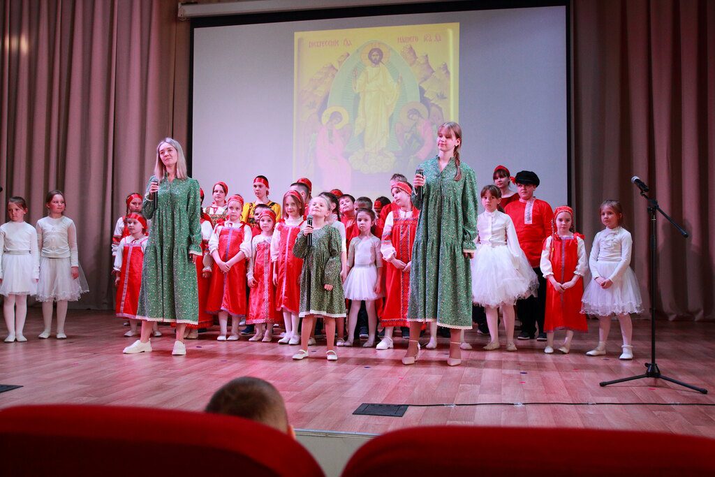 Концерт начался с пасхального хоровода, затем вместе с залом дети исполнили Тропарь Пасхи.