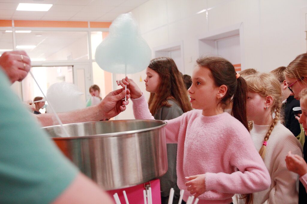 После концерта детей ждал вкусный чай с пирогами, пончиками и конфетами, а также сладкая вата.