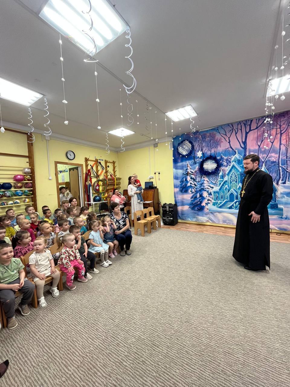 Батюшка угостил детсадовцев сладкими подарками.