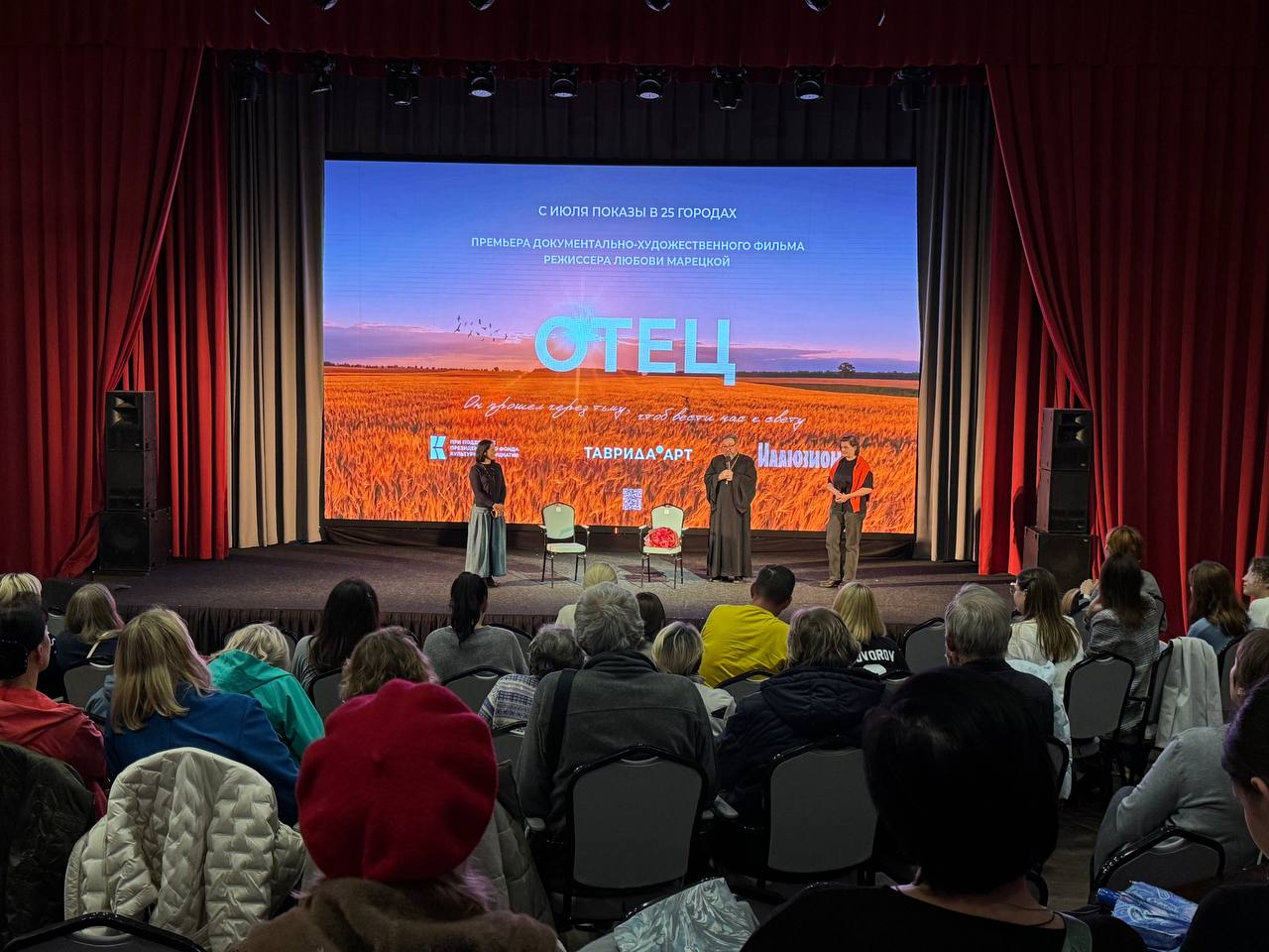 Настоятель Мироносицкого храма иерей Павел Малкин обратился к присутствующим со словами о том, что любая война – это не цифры и статистика, это судьба каждого отдельного воина, его родных. И об этом – фильм «Отец».