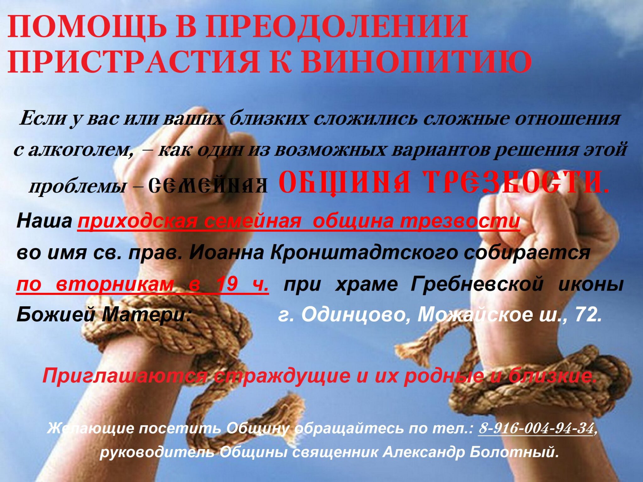 Если у вас или ваших близких сложились сложные отношения с алкоголем и вы хотели бы что-то изменить в своей жизни, но не знаете, как это сделать и даже с чего начать, – как один из возможных вариантов решения этой проблемы – ОБЩИНА ТРЕЗВОСТИ.