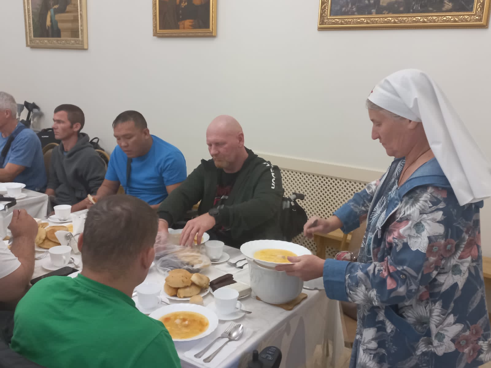 Заранее согласованная с сестрами милосердия программа встречи воинов в святой обители включала в себя: молитву на Божественной Литургии, праздничный обед в монастырской трапезной, концерт с патриотическими песнями и стихами детей Ворошиловской общеобразовательной школы, исполнение духовных кантов сестрами монастыря, душеполезная беседа со священником. После чего воинам была проведена интересная экскурсия по монастырю с рассказом о героях Бородинской битвы и советских воинах ВОВ, защищавших Москву на бородинском поле в далеком 1941 году. По окончании экскурсии воины СВО с большим энтузиазмом и желанием посмотрели музейную экспозицию «Бородино в годы Великой Отечественной войны», находящуюся на территории монастыря.