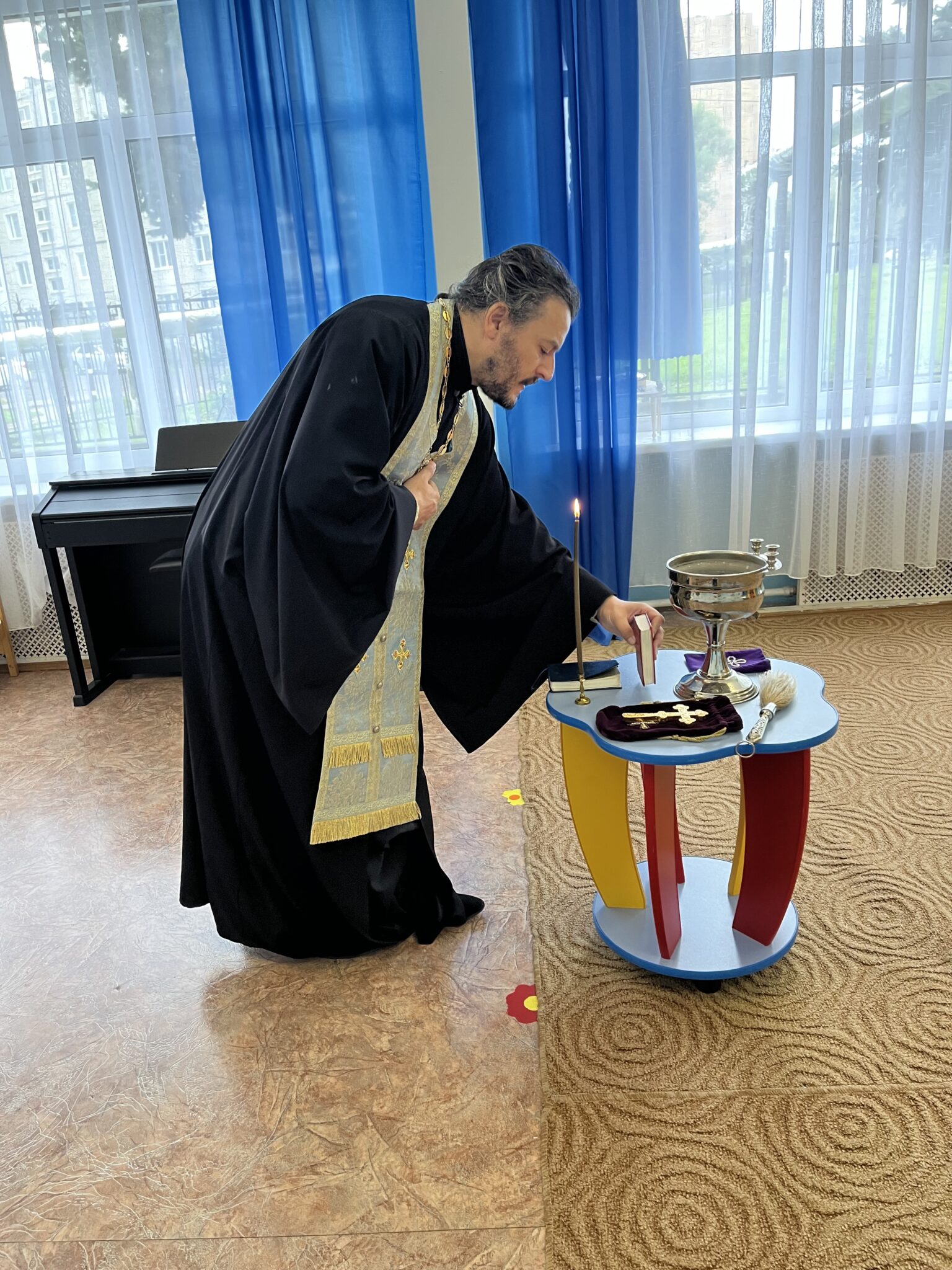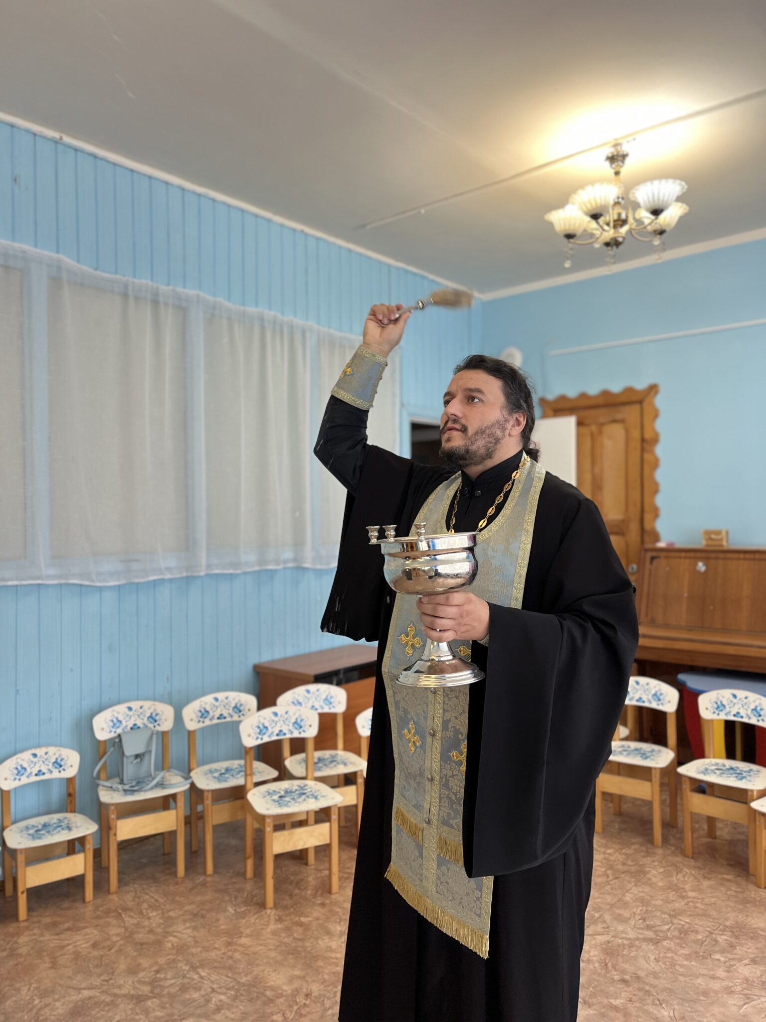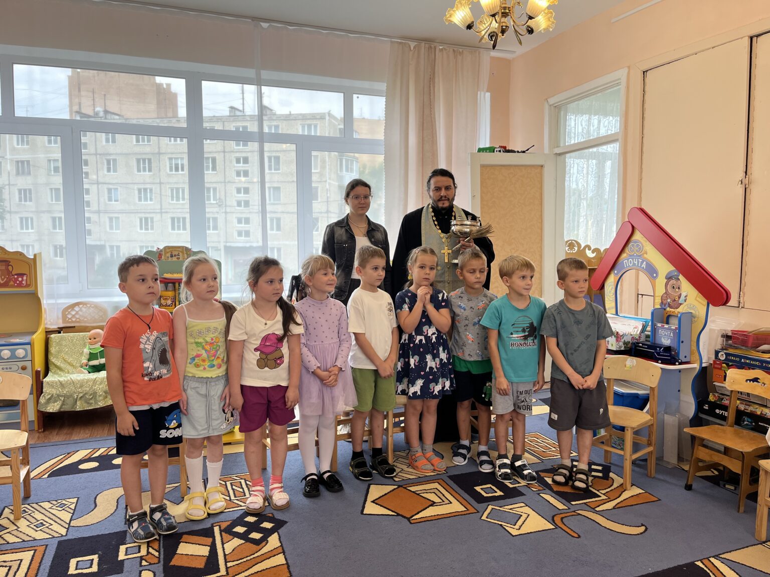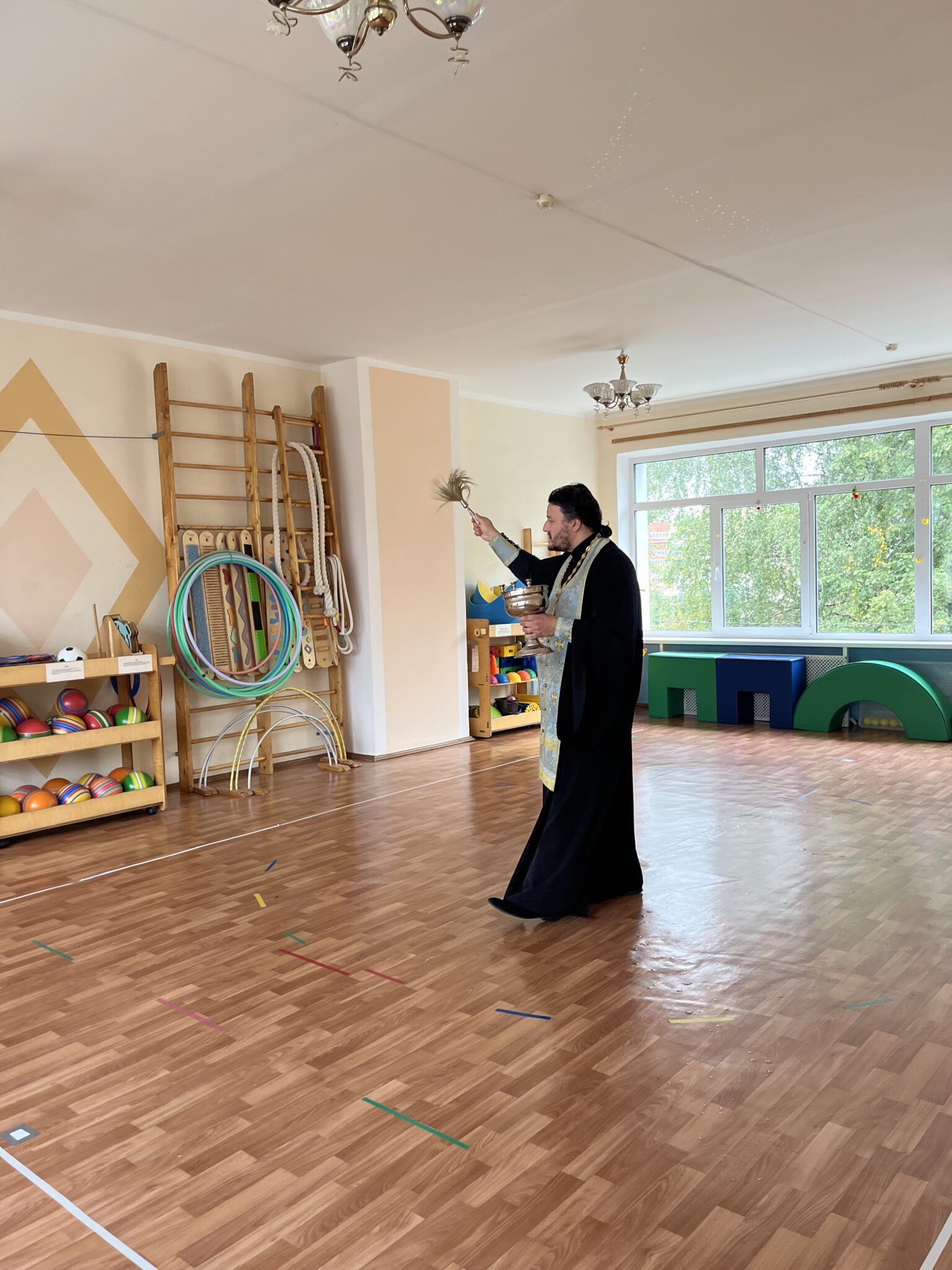 29 августа настоятель Христорождественского храма села Филатово священник Роман Лазарев посетил дошкольное отделение Глебовской общеобразовательной школы – детский садик №3. По просьбе коллектива воспитателей батюшка совершил молебное пение и окропил помещения детского сада Богоявленской водой.