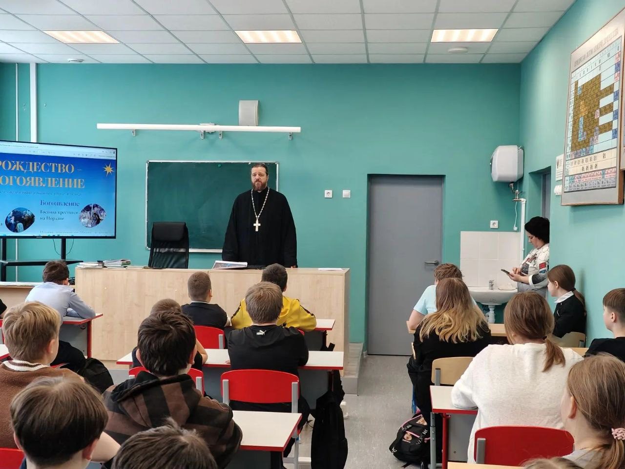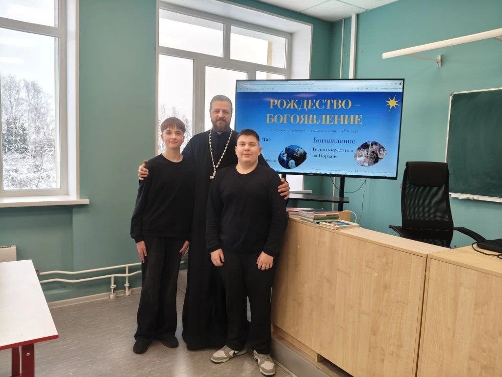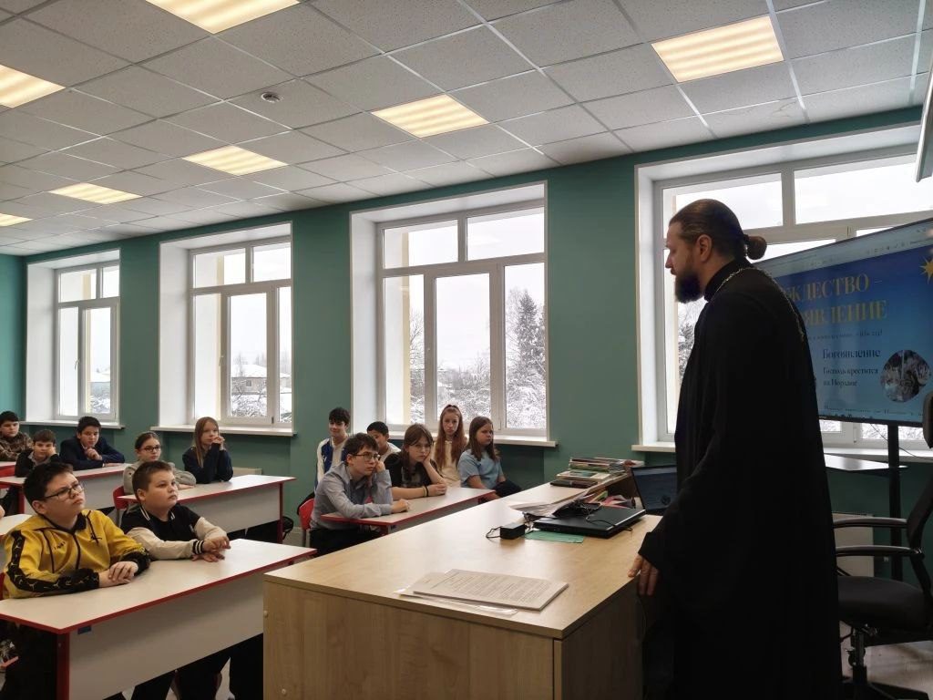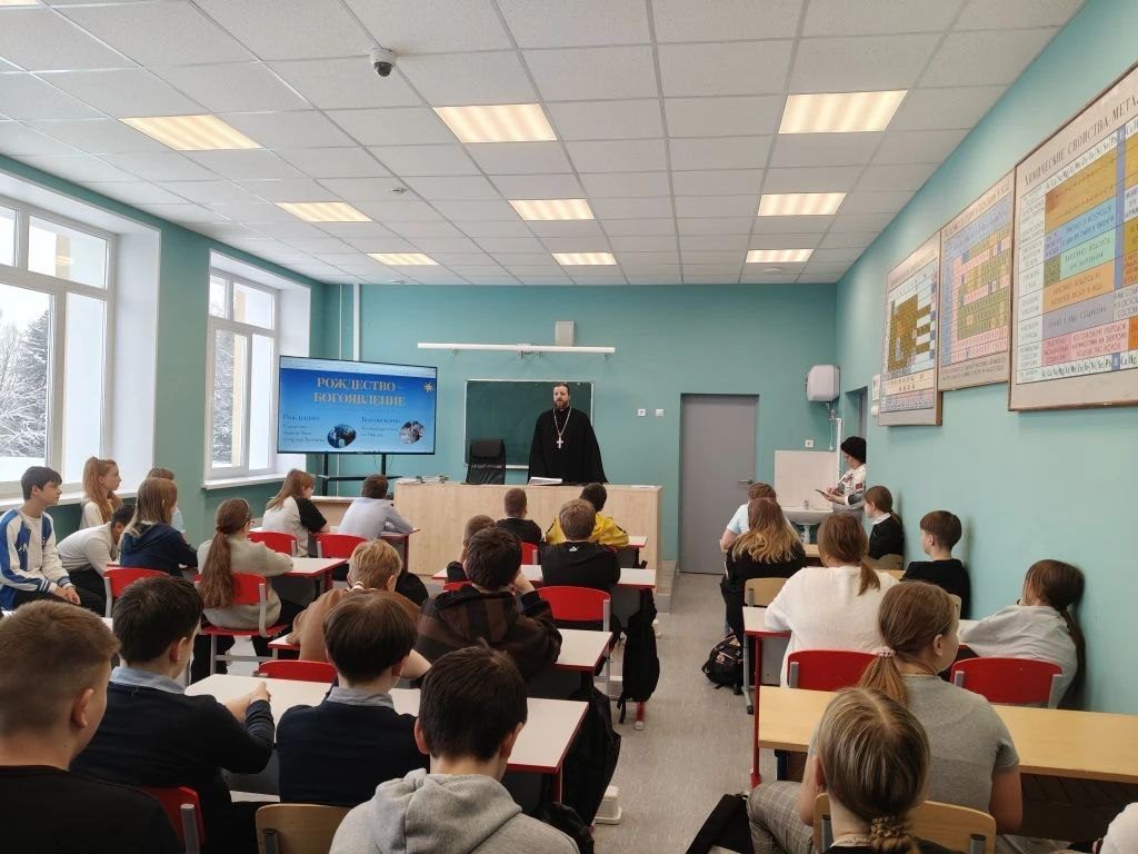В рамках Рождественской миссионерской акции, отец Игорь рассказал ученикам о Рождестве Христовом и явлении Бога в наш тварный мир.