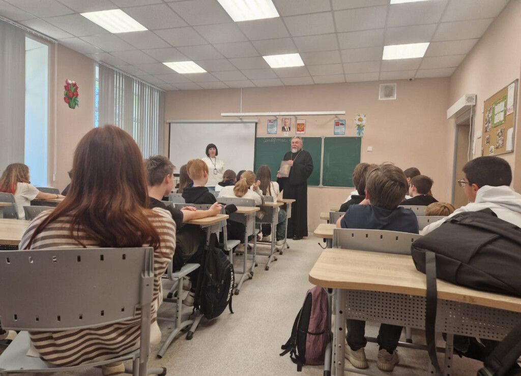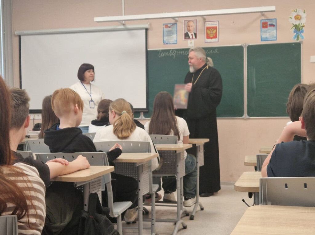 Батюшка также рассказал об образах на тему поста и праздника Светлого Христова Воскресения, ответил на вопросы учащихся. В завершении пожелал всем сил и терпения в учебе и каникулярном отдыхе, и пригласил посетить храмы в оставшиеся дни поста и предстоящих праздников. Школьному педагогу на память была подарена книга о древних иконах и их истории.