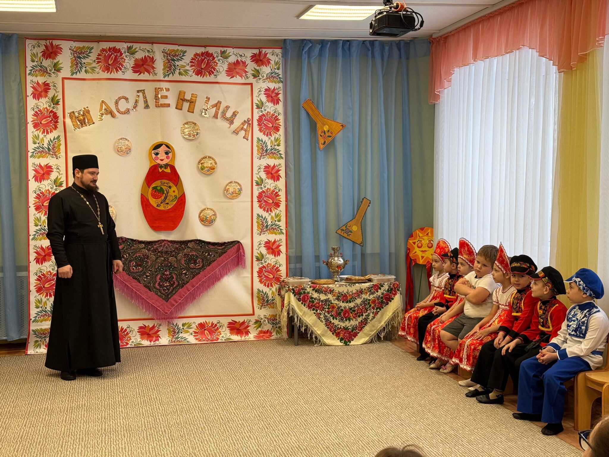 Священник Никита Митякин, настоятель храма Преображения Господня, посетил праздничные мероприятия в детском саду №18 с.Спасс, связанные с проводами зимы и празднование масленицы.