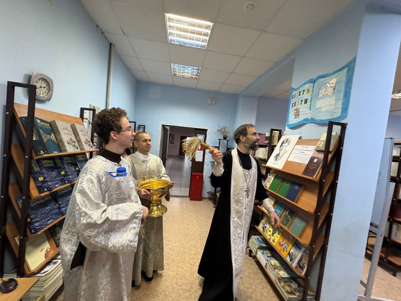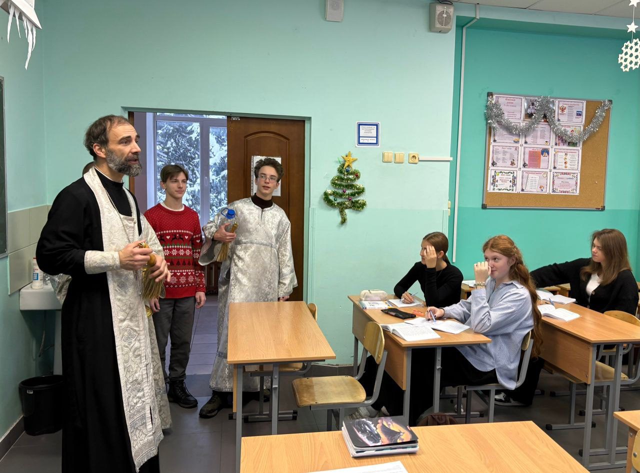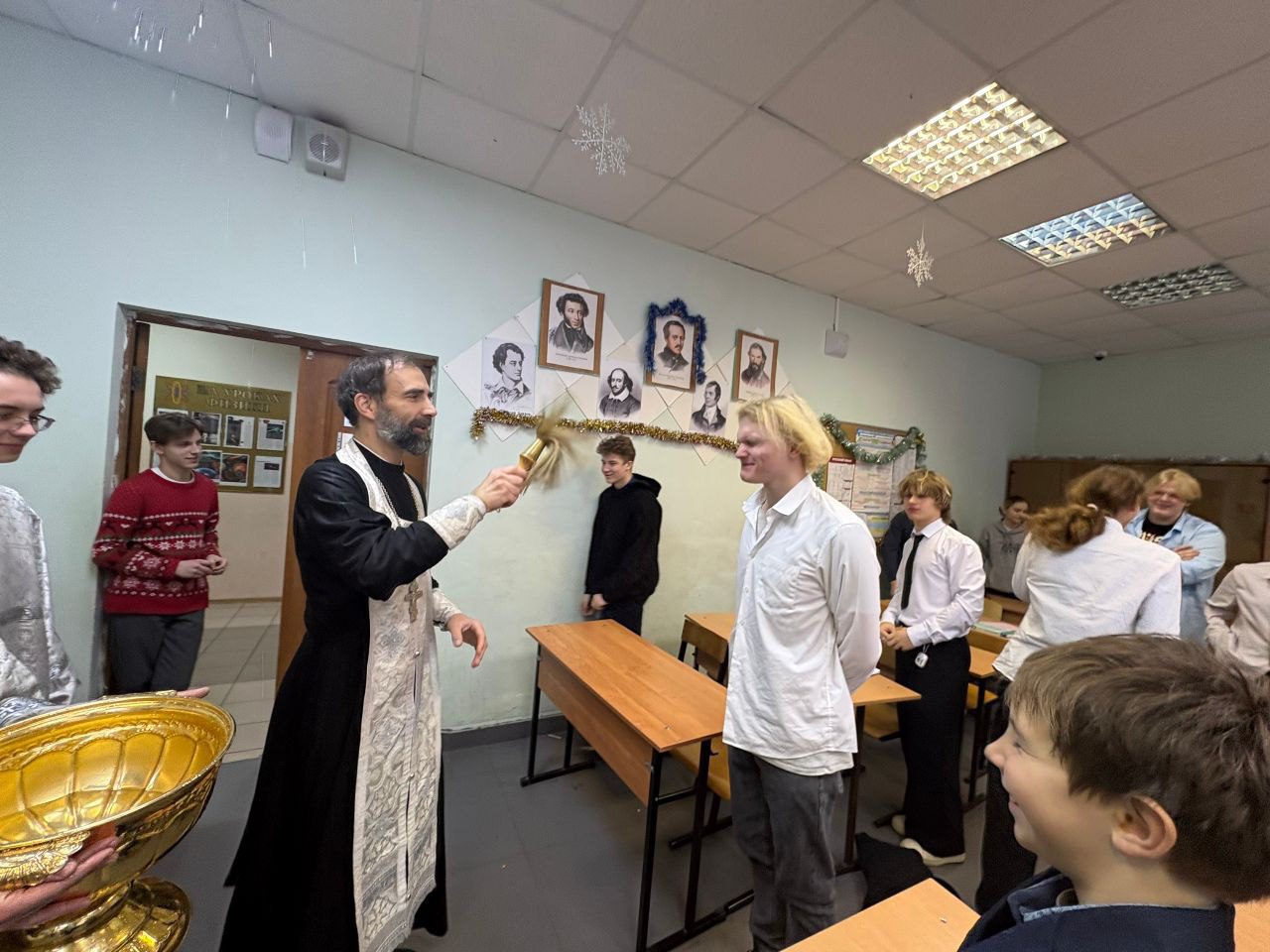19 января, в праздник Крещения Господня клирик Георгиевского храма г. Дедовск иерей Алексий Кравченко посетил МОУ “СОШ имени А.П. Белобородова”. После краткой молитвы и пения тропаря праздника Крещения, освященной водой были окроплены все классы и кабинеты. Школьники , которые еще оставались в школе на седьмом уроке, попросили благословения и с радостью приняли гостей.
