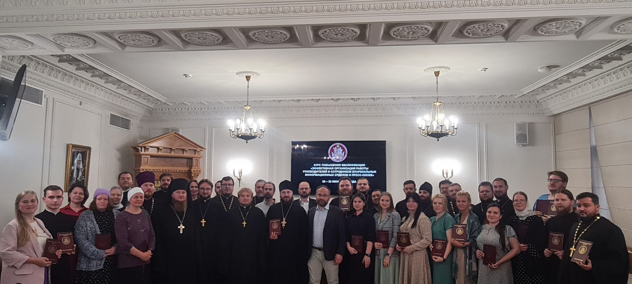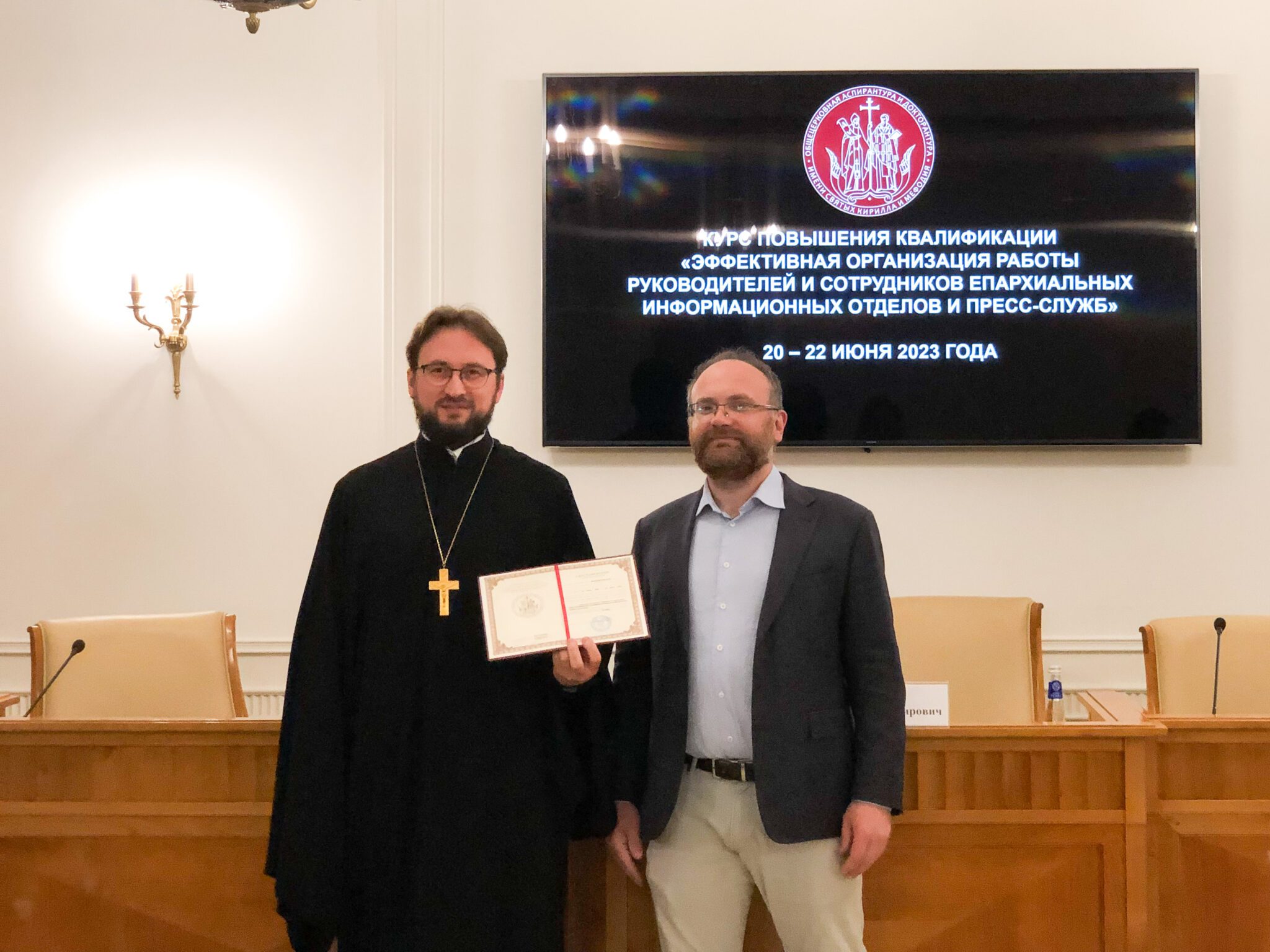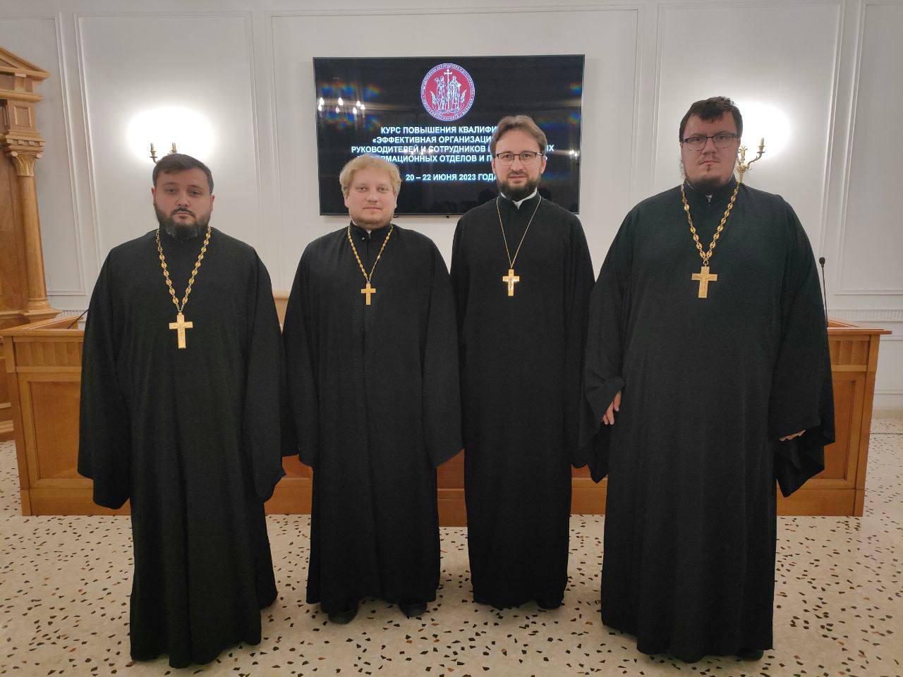 20-22 июня 2023 года в Общецерковной аспирантуре и докторантуре имени святых равноапостольных Кирилла и Мефодия состоялись курсы повышения квалификации духовенства «Эффективная организация работы руководителей и сотрудников епархиальных информационных отделов и пресс-служб». С приветственным словом к слушателям обратился председатель Учебного комитета Русской Православной Церкви, ректор ОЦАД протоиерей Максим Козлов. Курсы реализуются с целью повышения профессиональных компетенций руководителей и сотрудников информационных подразделений епархий в вопросах организации информационной работы, продвижения епархиального контента в Интернете и развития епархиальных интернет-ресурсов. В программу курсов вошли выступления специалистов-практиков из подразделений Московского Патриархата, представителей государственных органов власти, преподавателей ведущих высших учебных заведений Москвы, ведущих представителей информационной индустрии. В частности, перед слушателями выступят председатель Синодального отдела по взаимоотношениям Церкви с обществом и СМИ, главный редактор журнала «Фома» В.Р. Легойда, писатель, журналист, радиоведущий С.Л. Худиев, директор радио «Вера» Р.А. Торгашин и др. Слушателями курсов в числе прочих стали: руководитель Пресс-службы Московской митрополии священник Павел Галушко; ответственный за взаимодействие с обществом и СМИ Коломенской епархии, главный редактор сайта Московской митрополии священник Димитрий Степаненков; председатель Епархиального отдела Одинцовской епархии по взаимоотношениям с обществом, издательской деятельности и связями со СМИ священник Илия Лукьянов; председатель Епархиального отдела по издательской деятельности и связям со СМИ Подольской епархии священник Антоний Киндяков.