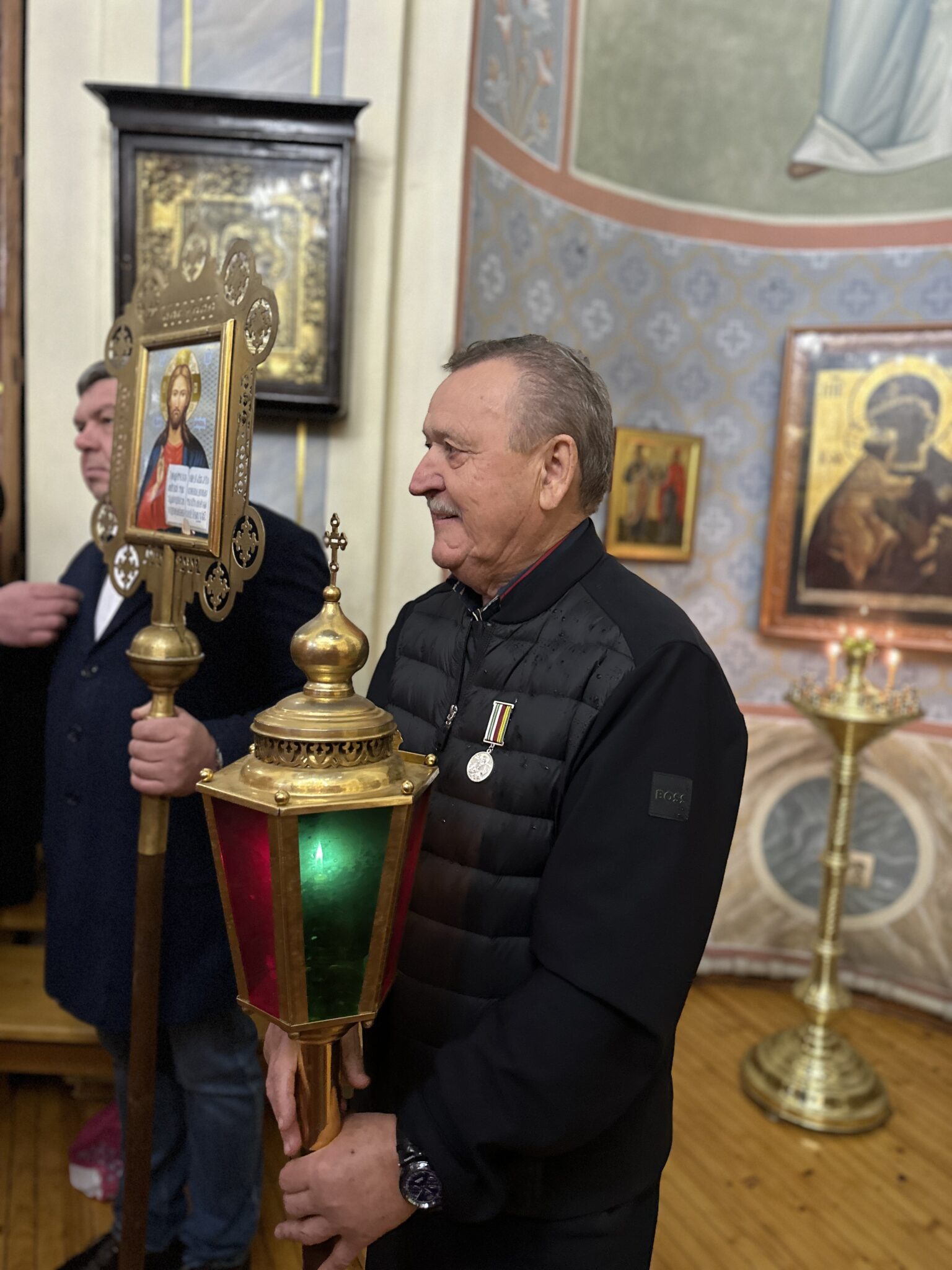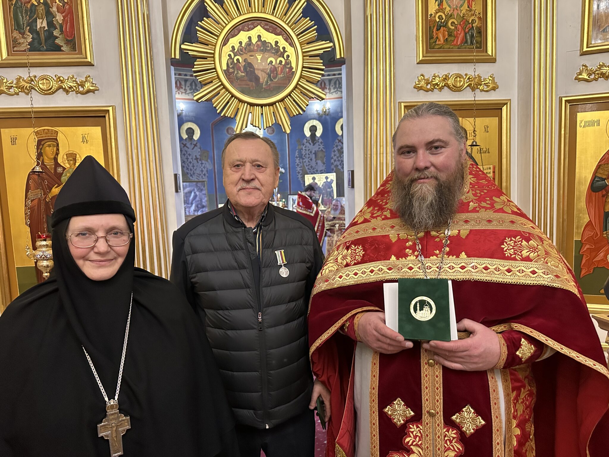 В этот день также прошло торжественное награждение ктитора храма Ковалева В. А. За усердные труды по реконструкции Колоцкого женского монастыря он был удостоен медали преподобного Левкия Волоколамского II степени.