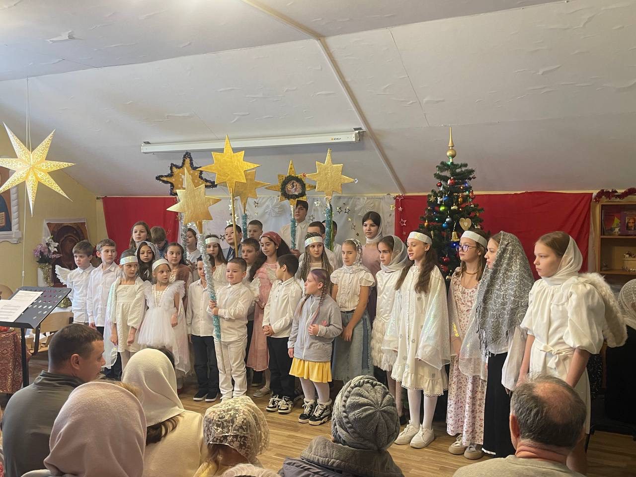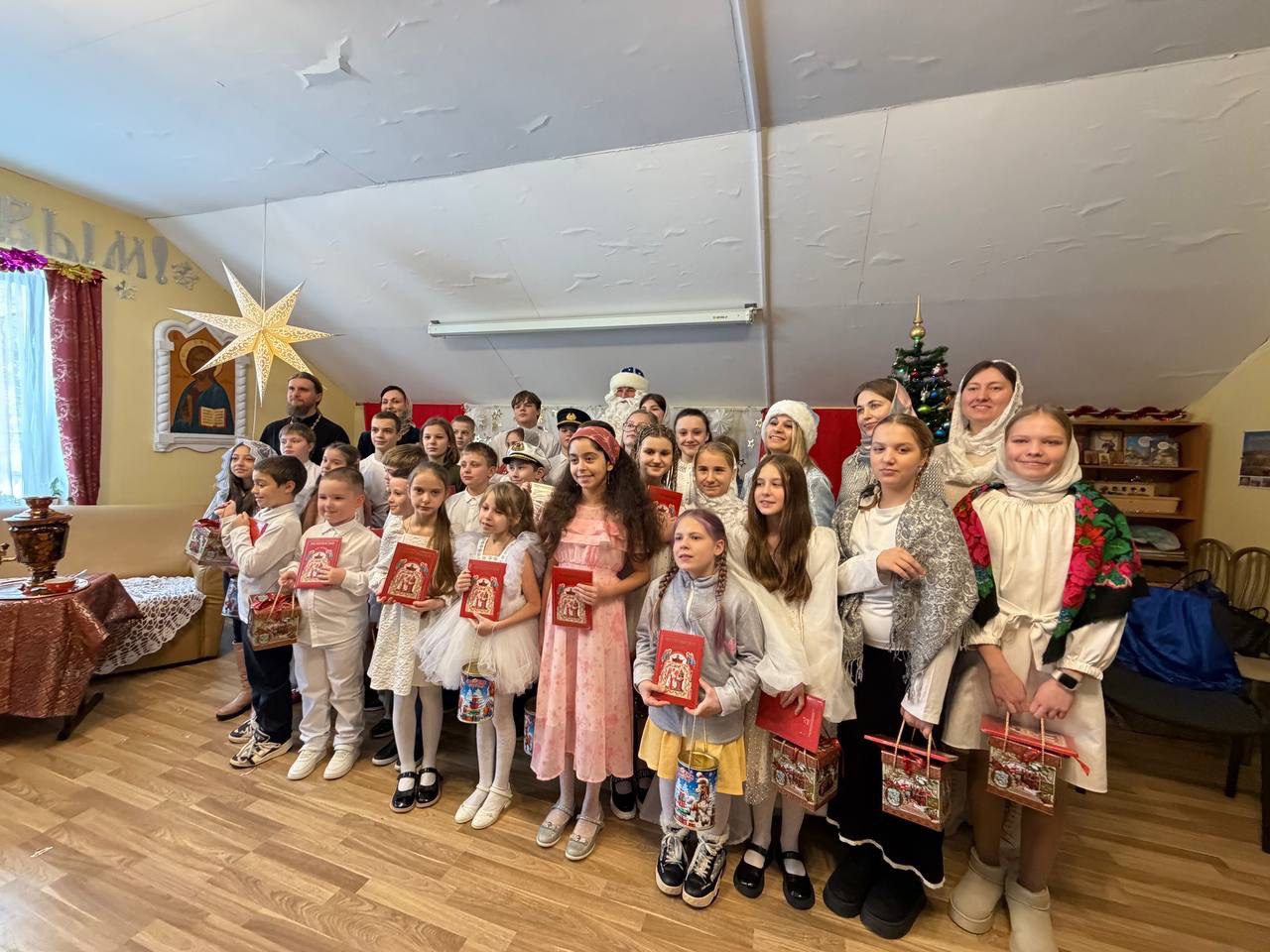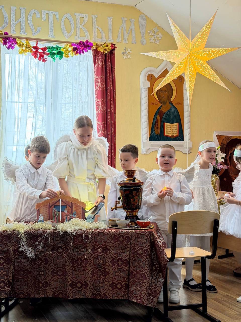 В начале праздника настоятель храма священник Алексей поздравил всех с Рождеством Христовым и святочными днями. Затем дети исполнили колядки, читали стихи, показали танец ангелов, а в завершении представили душеполезную сценку «Красные сапожки».
