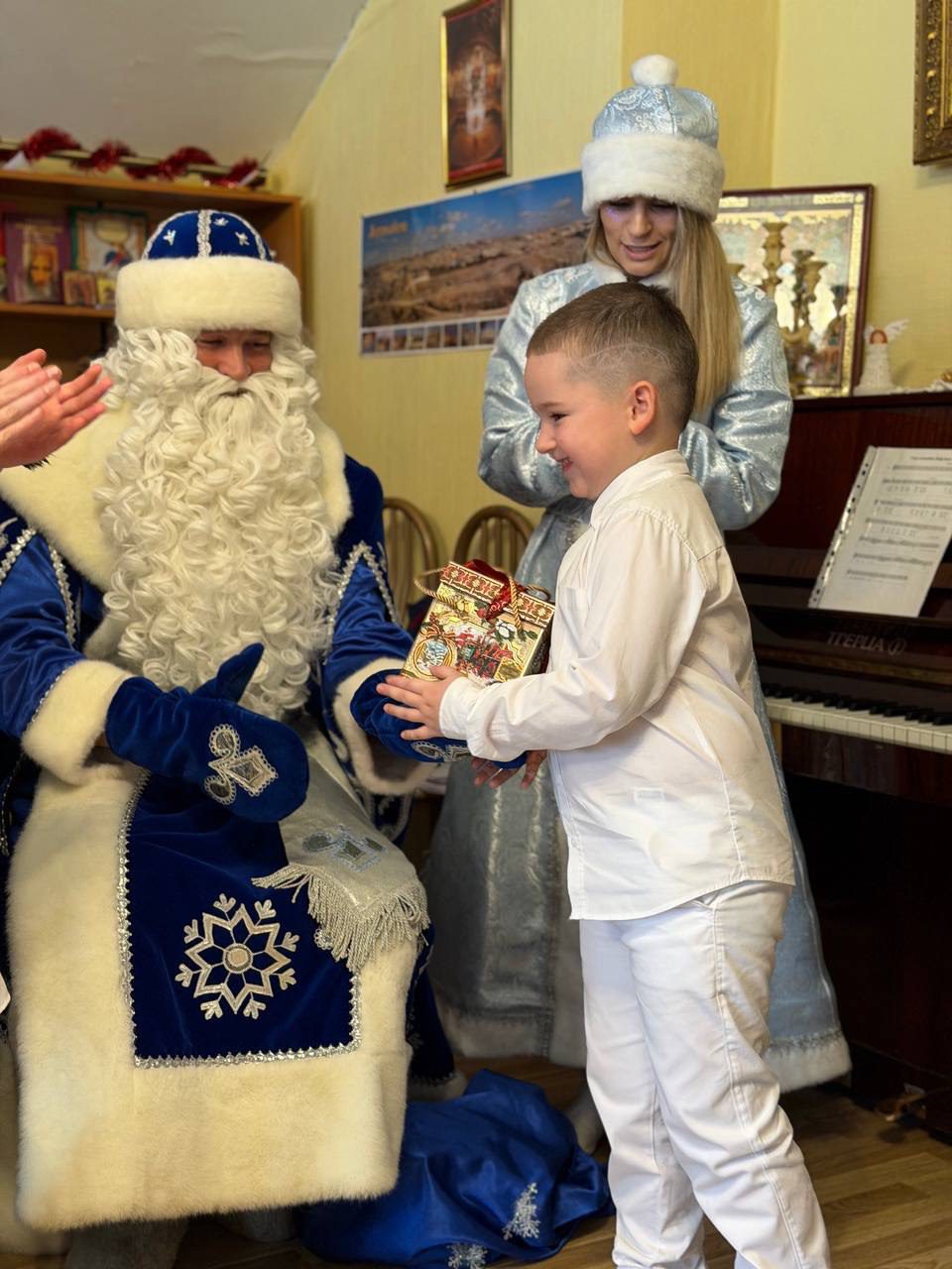 После сценки на праздник к ребятам пришли Дедушка Мороз и Снегурочка, которые одарили всех подарками.