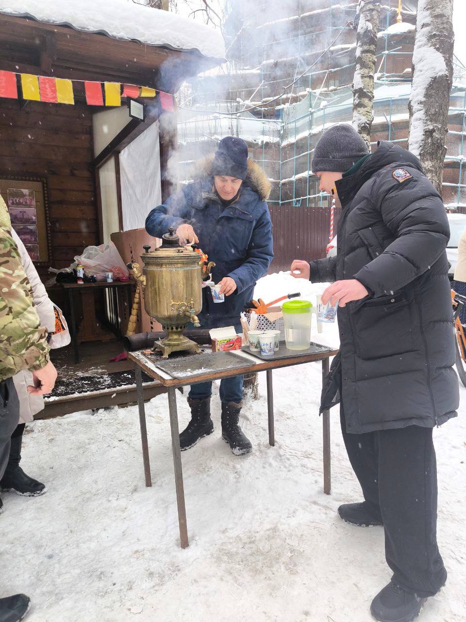 Особой теплотой отличалась уютная зона угощений. Здесь, под паром, пыхтел настоящий самовар, вокруг которого собирались гости. Всех желающих щедро угощали горячим ароматным чаем с традиционными сладостями: пряниками и конфетами. Это было не просто чаепитие, а момент живого общения, теплых бесед и совместного ощущения праздника.