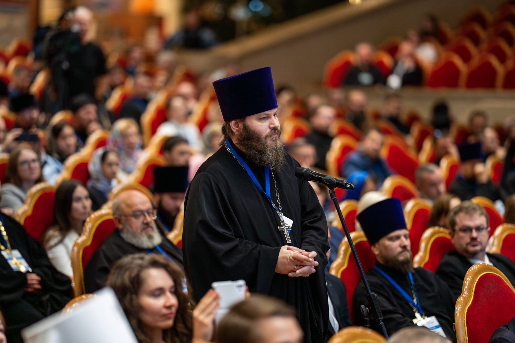 Затем Святейший Патриарх Кирилл ответил на вопросы участников фестиваля. Один из вопросов Его Святейшеству задал член Миссионерского отдела Одинцовской епархии, настоятель Георгиевского храма п. Нахабино иерей Павел Островский: