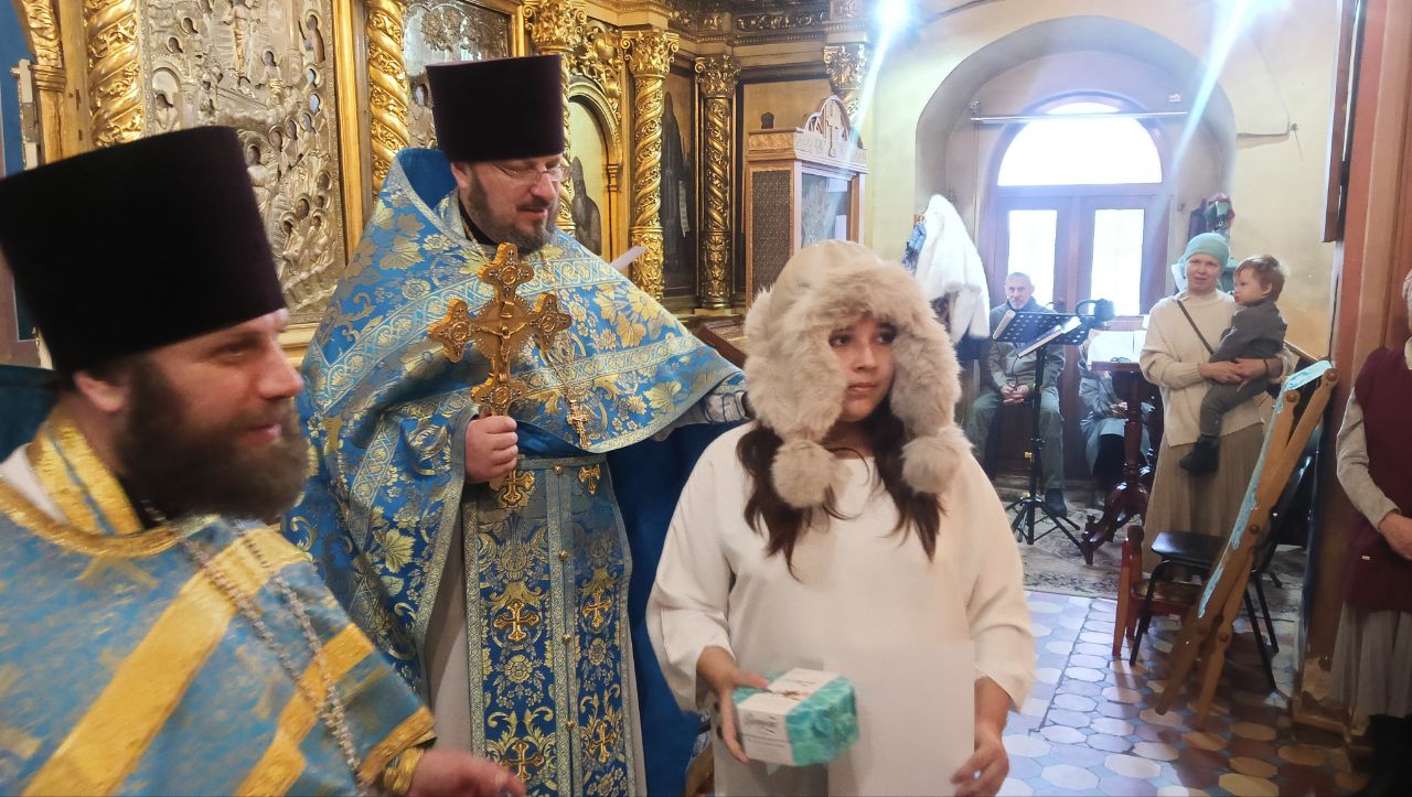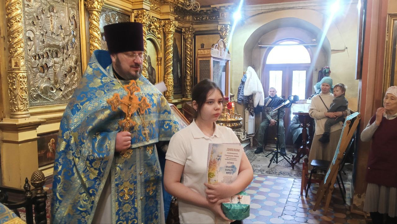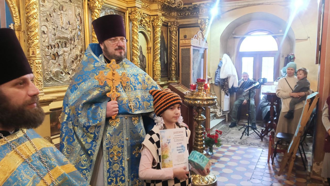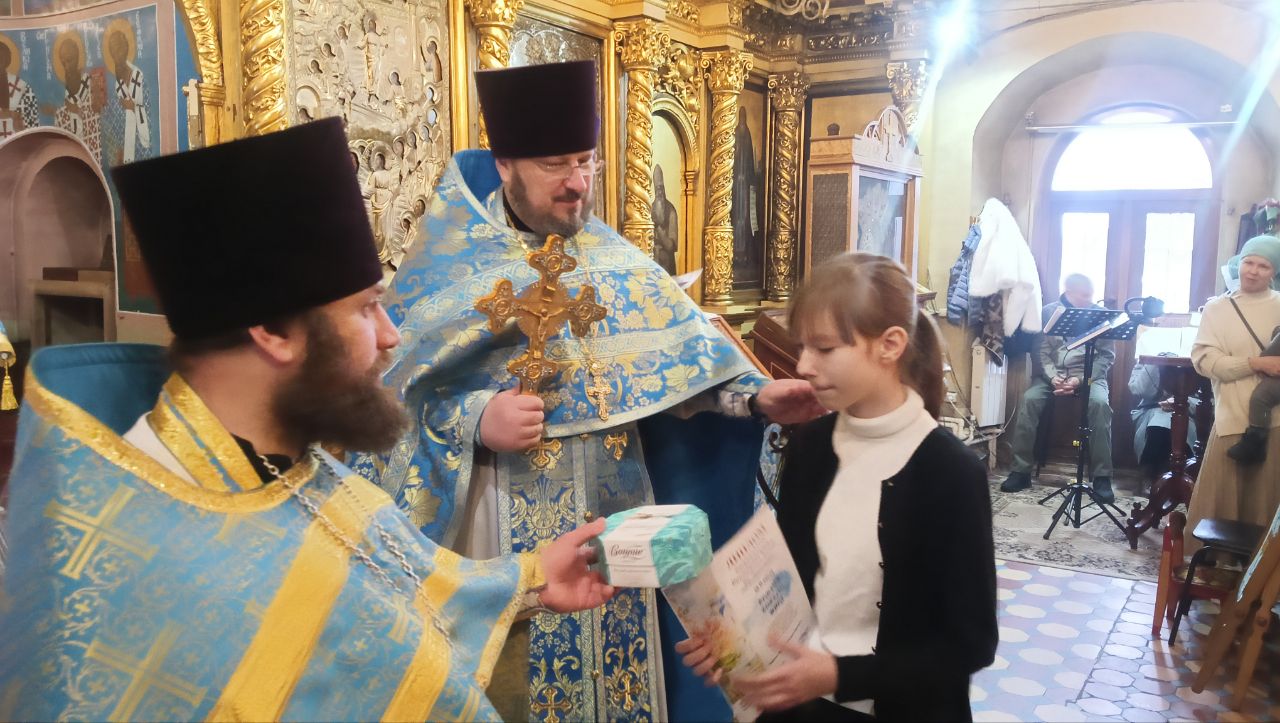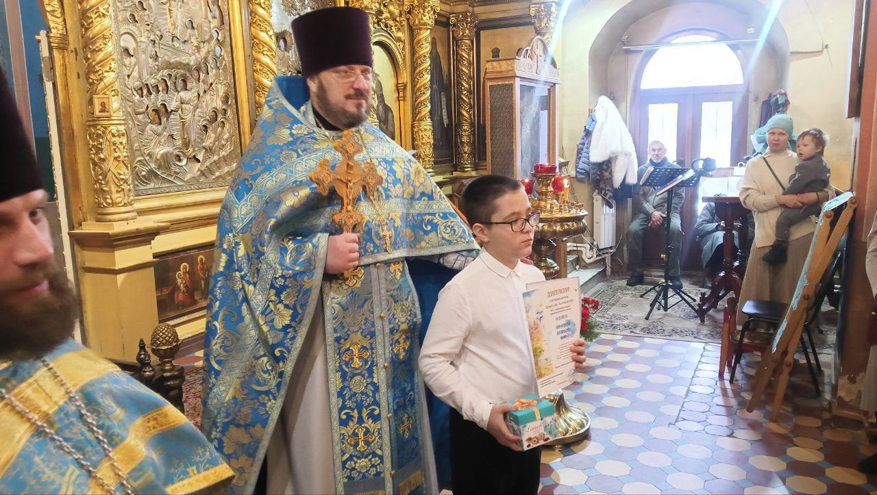 По окончании литургии благочинный вручил грамоты и сладкие подарки победителям творческого конкурса “Красота Божьего мира -2025” и конкурса чтецов духовной поэзии, прошедшего в рамках Рождественских чтений в Волоколамском округе.