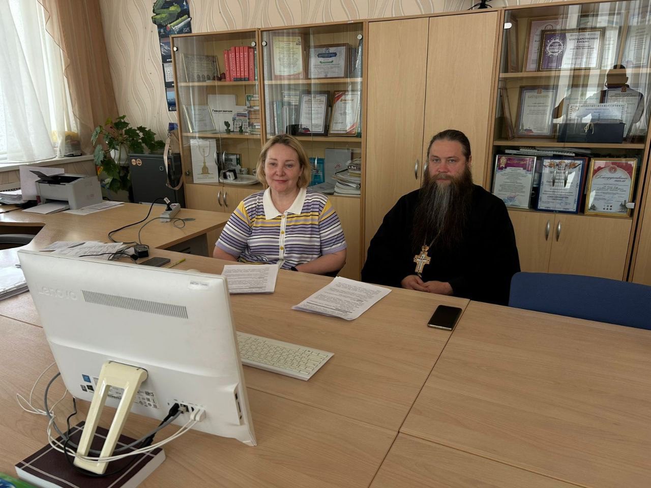 На встрече присутствовали руководитель Волоколамского филиала ” МГУТУ им. К.Г. Разумовского” Сепиашвили Е.Н. и духовник ВУЗа священник Михаил Поляков настоятель Христорождественского храма г. Волокаламска.