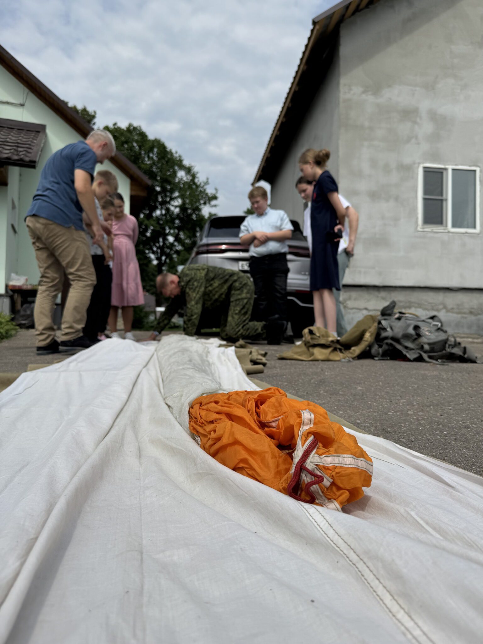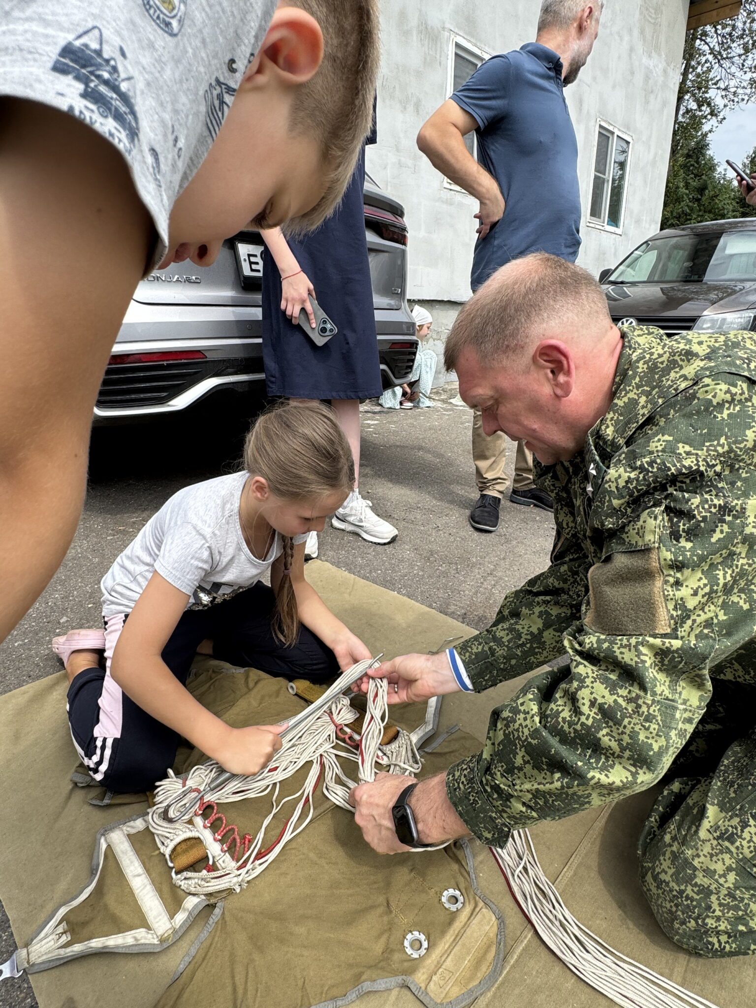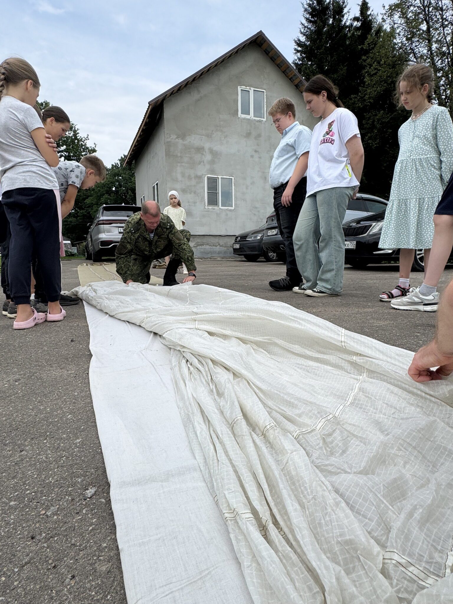 Под руководством опытных десантников из взрослой воскресной школы дети осваивали навыки укладки парашюта: изучали устройство парашюта Д-6 серии 4, который наряду с более современным Д-10 используется в ВДВ, и своими руками укладывали запасной парашют З-5. Также они учились подгонке и надеванию подвесной системы, пробовали, каково это — носить её и двигаться с парашютом.