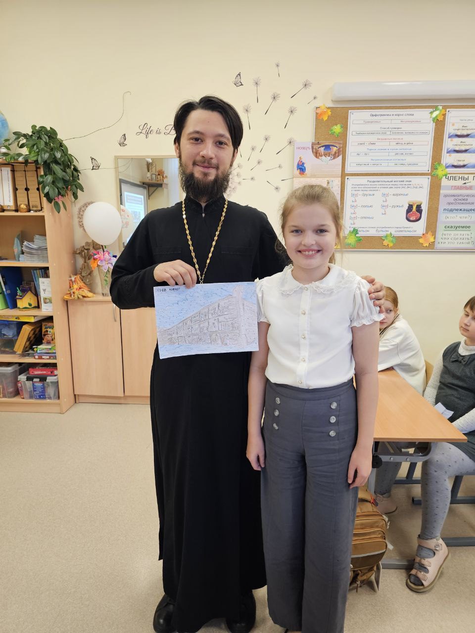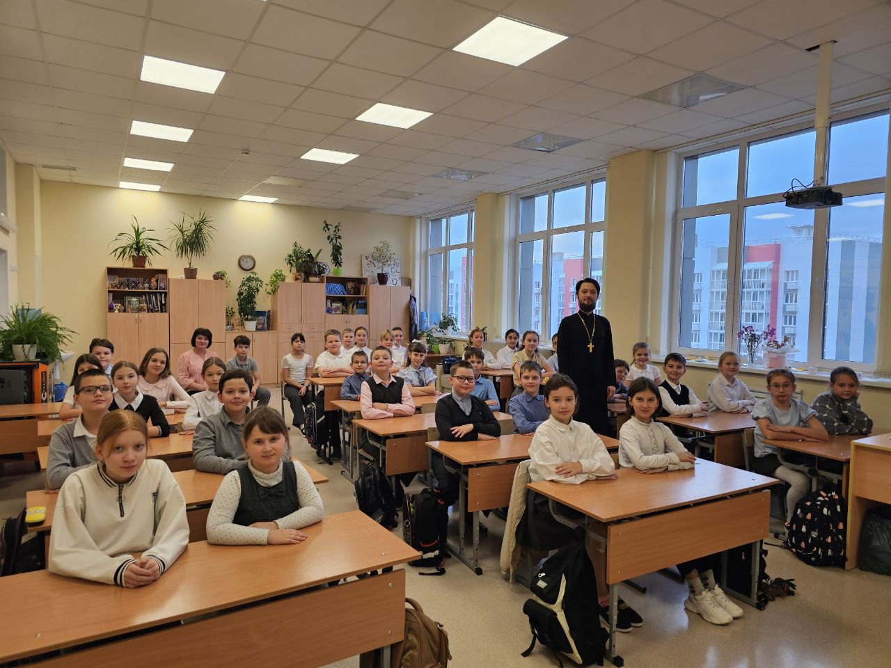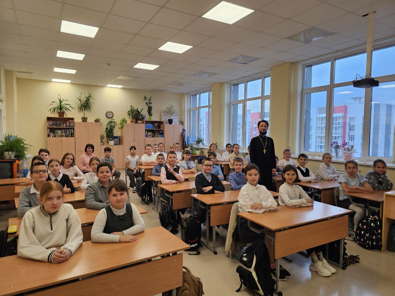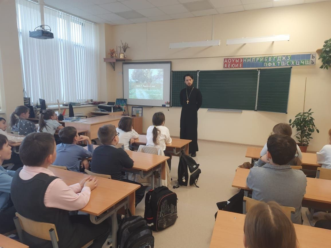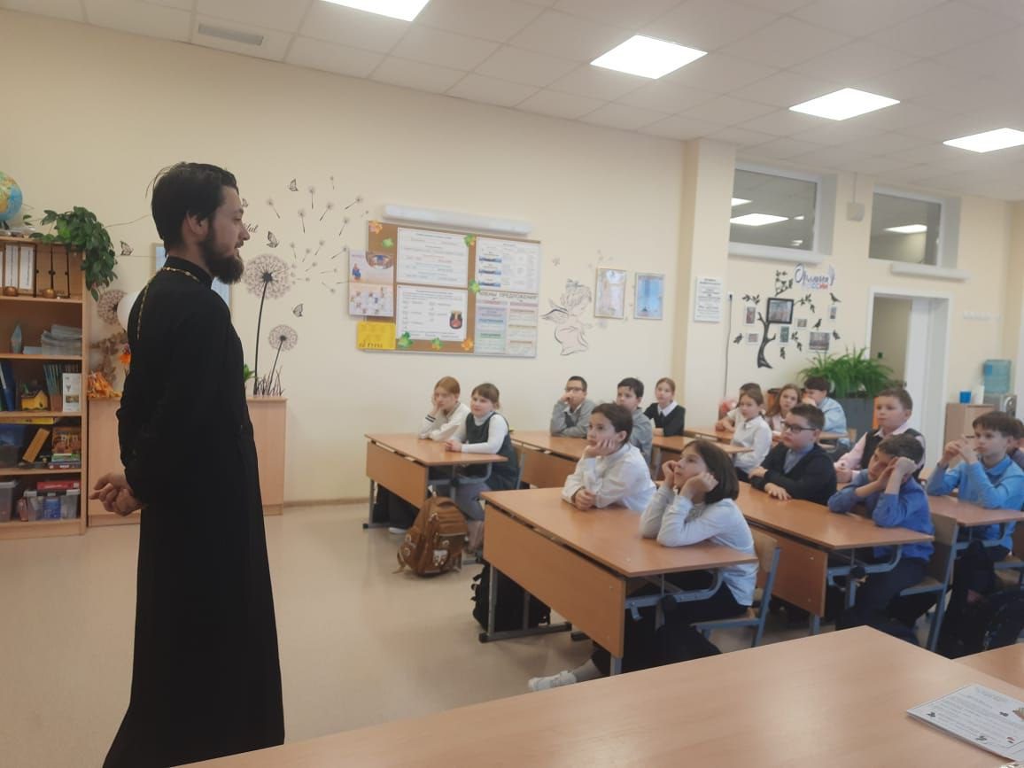 14 ноября в рамках преподавания модуля “Основы православной культуры” по приглашению Светланы Владимировны Нужной настоятель Ильинского храма с. Ильинское священник Евфимий Княжев провёл занятие в 4 “Б” и 4″В” классах Волоколамской гимназии №1.