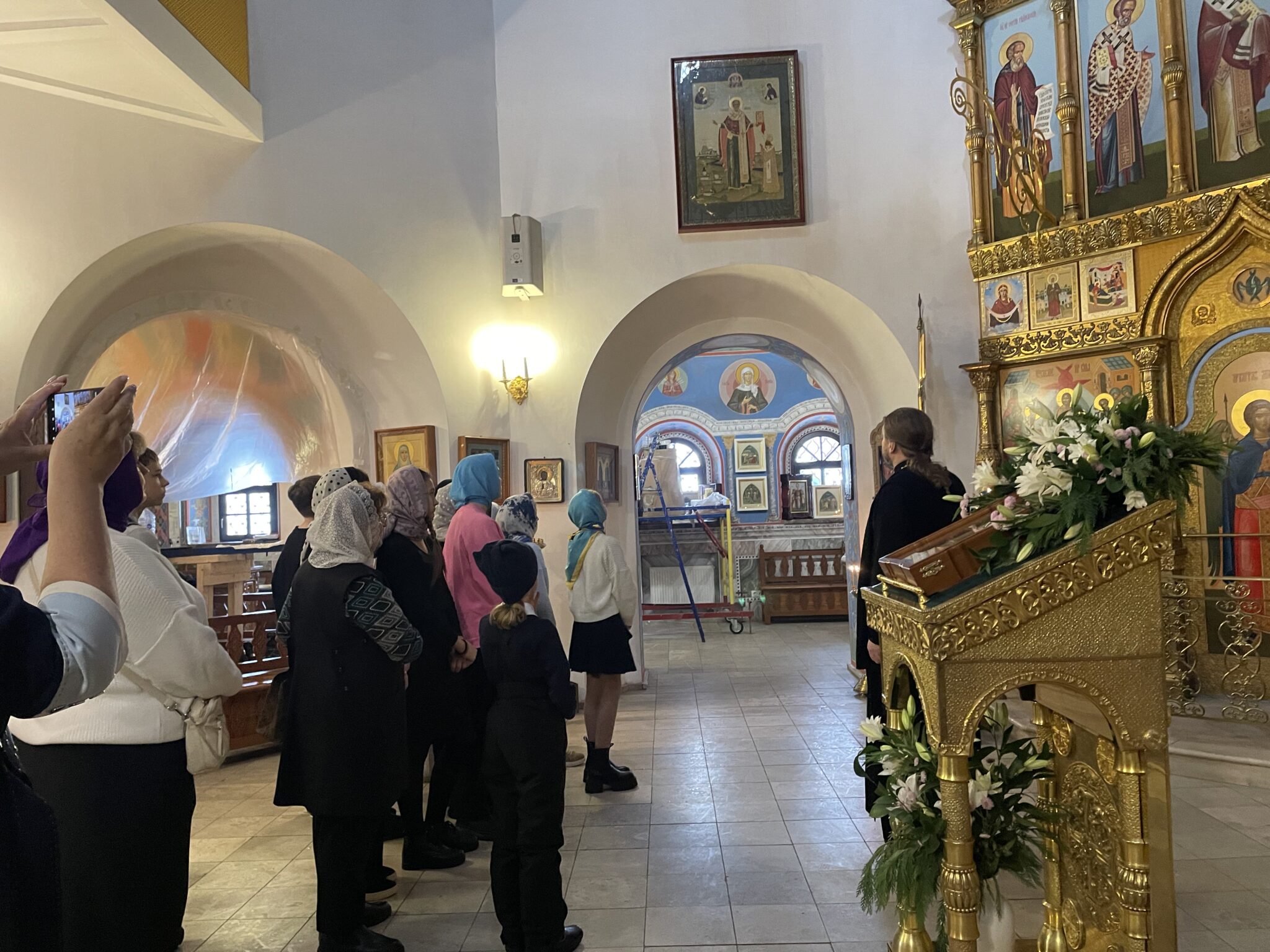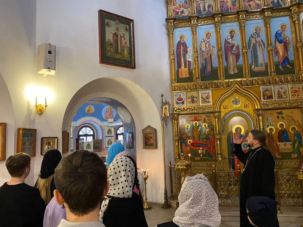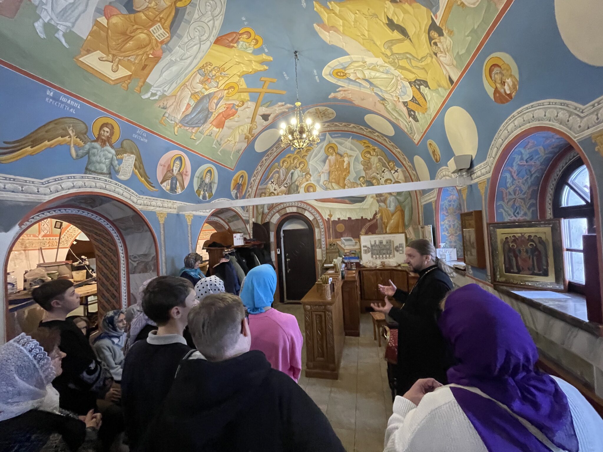Ученики и преподаватели школы ознакомились с этапами росписи храма и пообщались с художниками. Настоятель храма — протоиерей Вячеслав Коновалов рассказал смысловое значение росписи и познакомил с благоустройством православного храма.