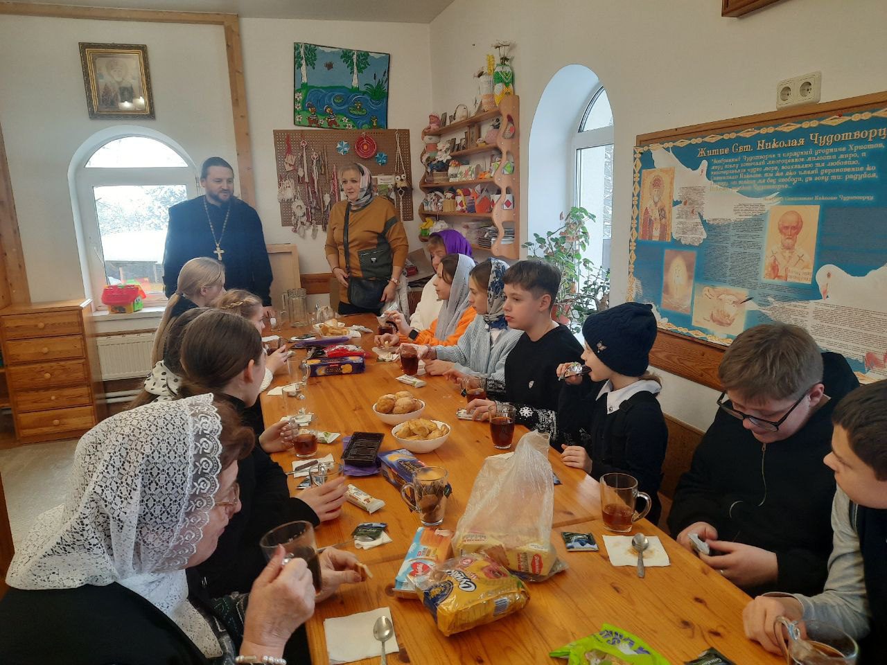 Продолжение встречи прошло за чаепитием в воскресной школе, где ребята задавали вопросы настоятелю храма о православных праздниках, иконописи и о занятиях в воскресной школе.
