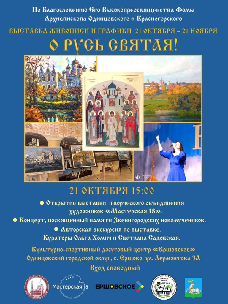 21 октября в культурно-спортивном досуговом центре «Ершовское» открывается выставка живописи и графики «О РУСЬ СВЯТАЯ!». 21 октября 15:00 Открытие выставки творческого объединения художников «Мастерская 18». Концерт, посвященный памяти Звенигородских новомучеников. Авторская экскурсия по выставке. Кураторы Ольга Хомич и Светлана Садовская.