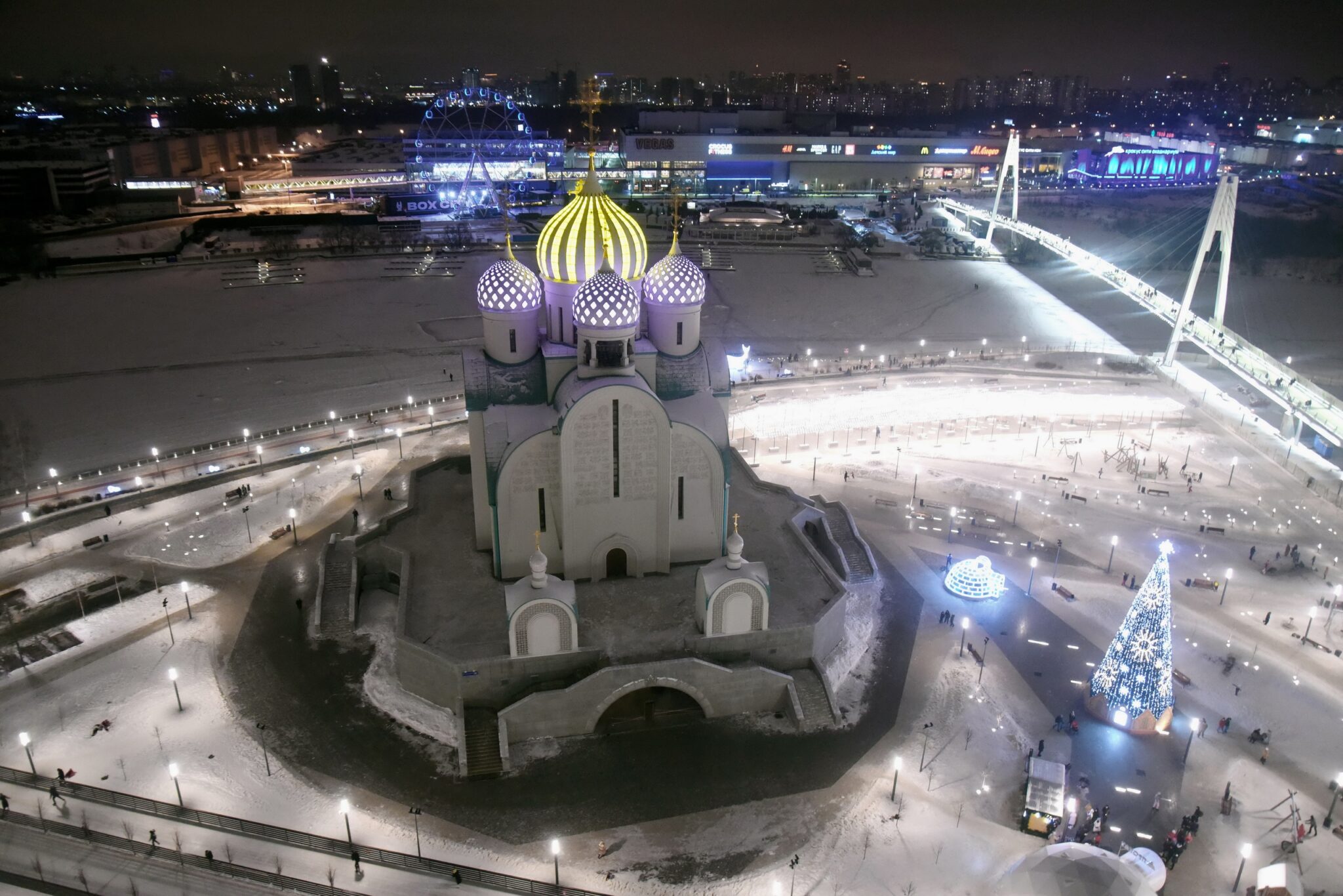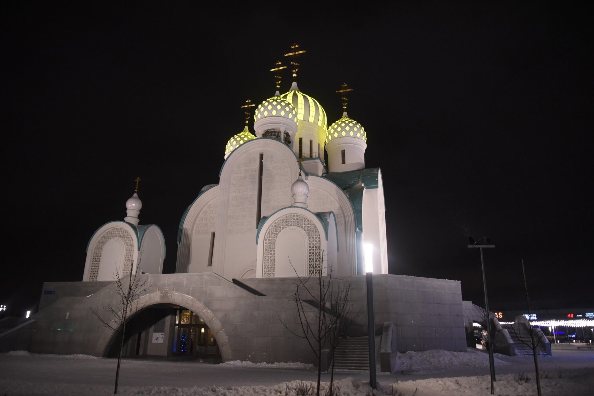 Высота храма – 55 метров. Храм рассчитан на полторы тысячи человек. Монолитное железобетонное здание храма, общей площадью около 4.500 квадратных метров, построено в два этажа, соединенных между собой тремя лестницами. Для удобства прихожан в церкви имеется 3 лифта. Бетонные элементы купола покрыты смальтовой керамикой, а в окошки вставлены светопрозрачные элементы. В итоге, в зависимости от праздника, купола храма будут светиться разными цветами. В инженерных сетях – самые передовые технологии: системы кондиционирования, дымоудаления, вентиляции. В комплексе зданий, находящихся в стилобатной части, есть классы для воскресной школы, комната для дошкольников, библиотека, две трапезные, конференц-зал, гардероб, помещение церковной лавки, комната для духовенства и настоятеля. Под стилобатом находится технический этаж с помещениями для ИТП, насосной и водомерного узла, электро-щитовой, вентиляционных камер и инженерных коммуникаций.